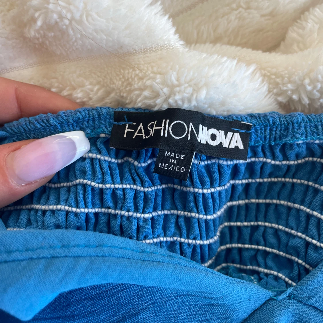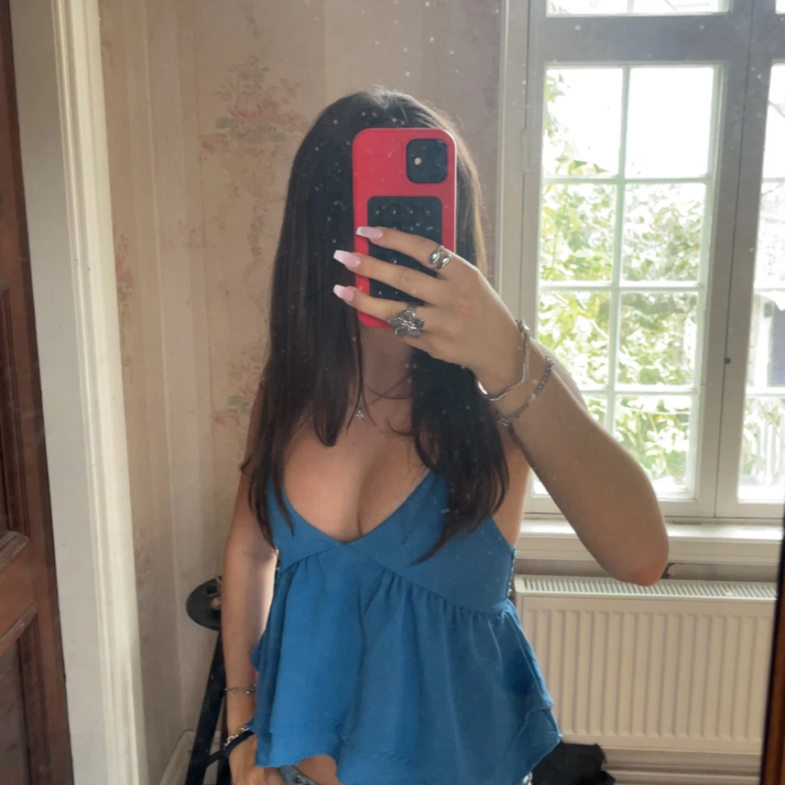 Supersöt unik blå topp från Fashion Nova med tunna axelband och djup v-ringning. I storlek XS. Säljer då den inte kommer till användning💕