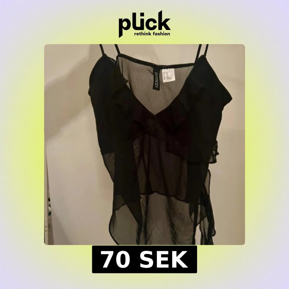 Säljer en svart, transparent linnetopp från Divided med tunna axelband och snygga volangdetaljer framtill. Toppen har v-ringning och är tillverkad i ett lätt, luftig material som ger en cool och trendig look.