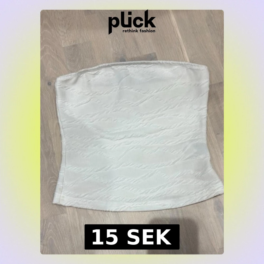 Säljer en stilren vit tubtopp med diskret strukturerat mönster. Toppen är axelbandslös och har en lätt figurnära passform. Perfekt att matcha med jeans eller kjol för en clean look.