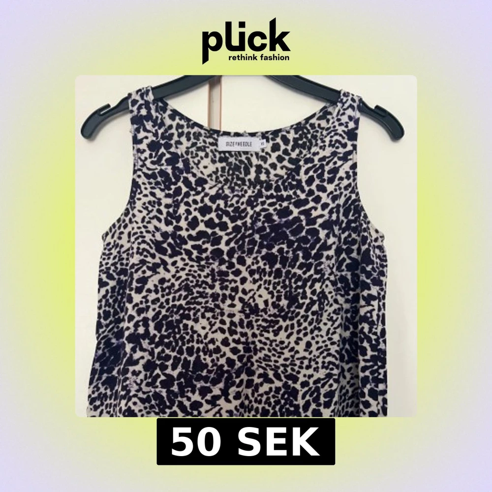 Snygg ärmlös linnetopp från Size Needle i XS med svart och vit leopardmönster. Toppen har rund halsringning och är tillverkad i ett lätt och luftigt material, perfekt för att sticka ut med ett coolt mönster.
