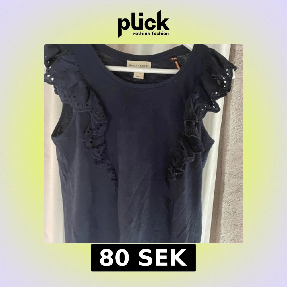 Supersöt mörkblå ärmlös topp från Holly & Whyte med volangdetaljer och broderade spetsar längs axlarna. Perfekt för dig som gillar feminina detaljer och enkel stil. Tillverkad i mjuk bomull som känns skön mot huden.
