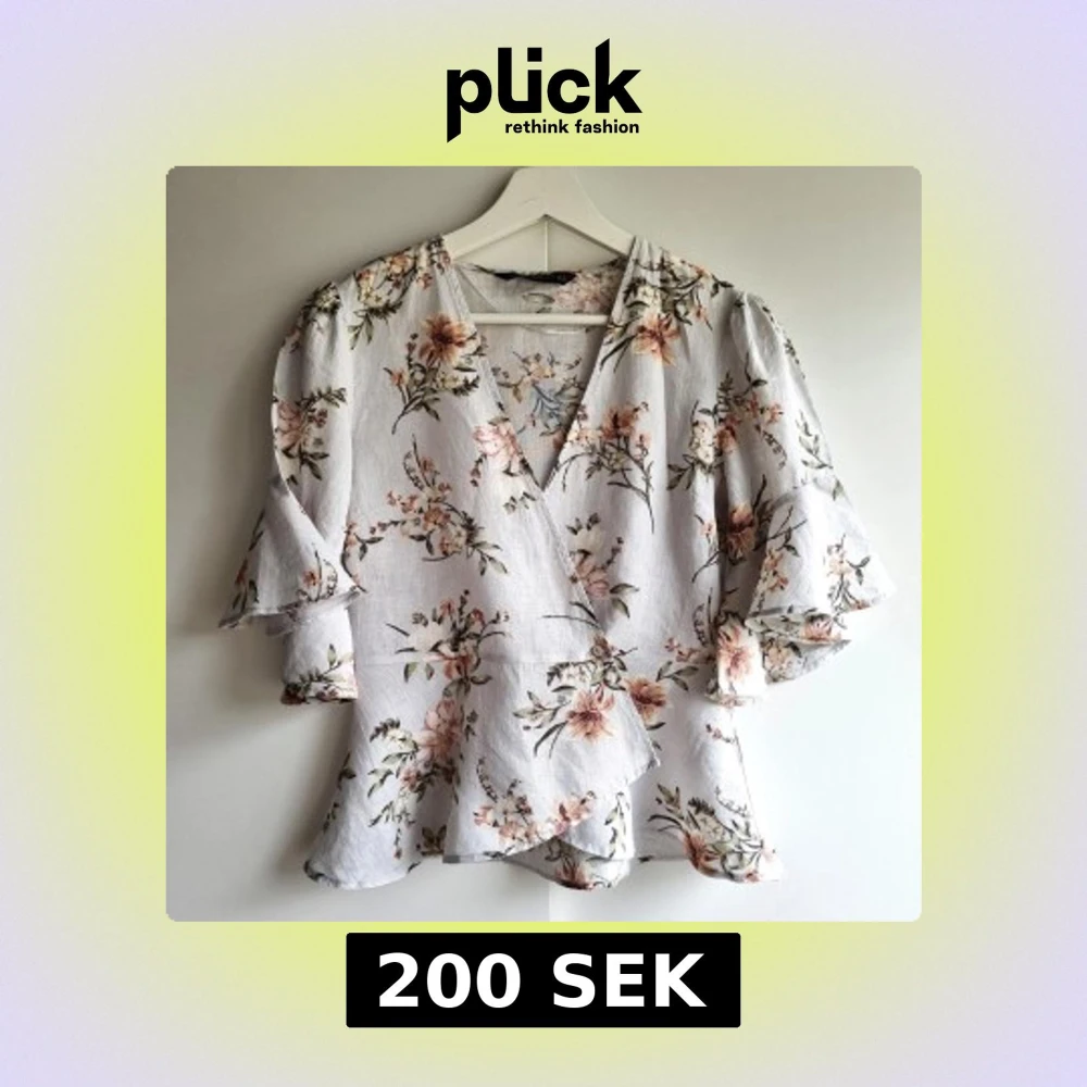 Superfin blommig omlottblus från Zara Woman i duvblått med vida trekvartsärmar och v-ringning. Blusen har ett romantiskt blommönster i rosa, vitt och grönt. Perfekt för vår och sommar när du vill känna dig extra söt. 100% linne, perfekt skick.