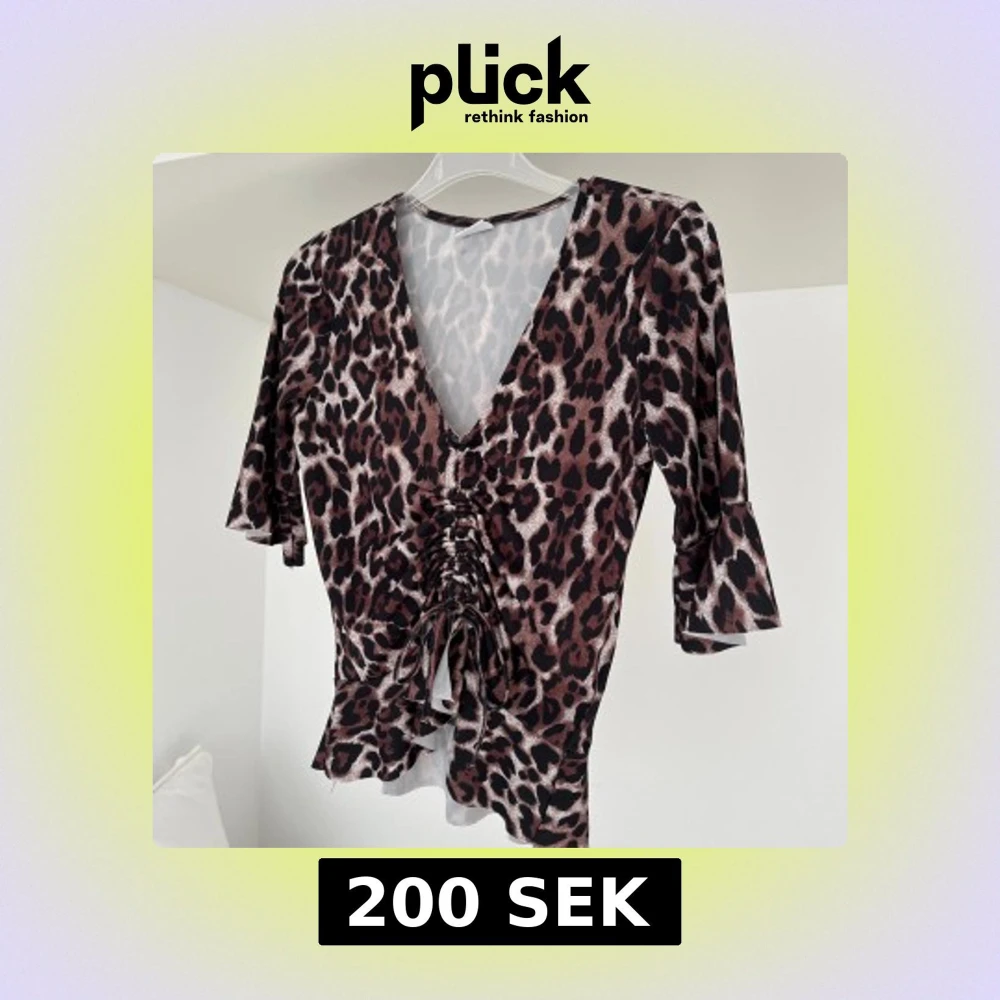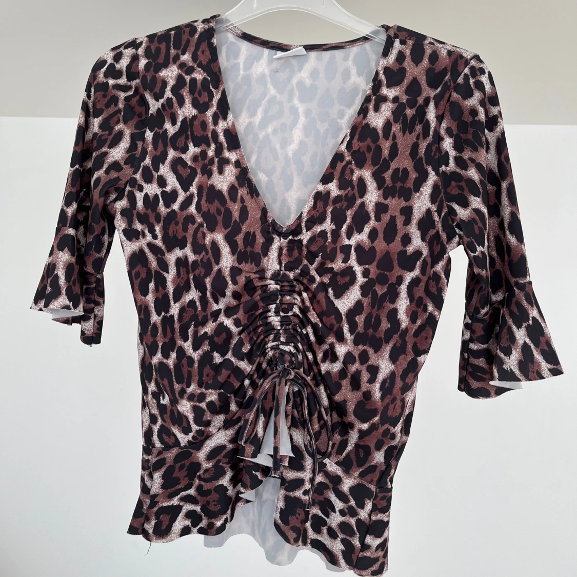 Säljer en leopardmönstrad topp med djup v-ringning och knyt framtill. Toppen har trekvartsärm och är figurnära i modellen. Perfekt för dig som vill sticka ut med ett trendigt mönster.