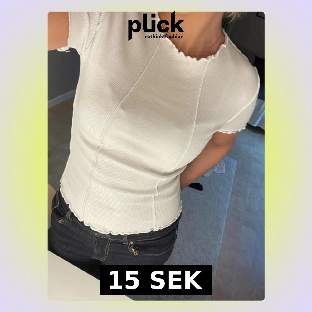 Säljer en vit ribbad topp med korta ärmar och vågiga kanter vid hals, ärmslut och nederkant. Toppen har figurnära passform och dekorativa sömmar framtill. I storlek XS men passar även mig som ofta har S🤍