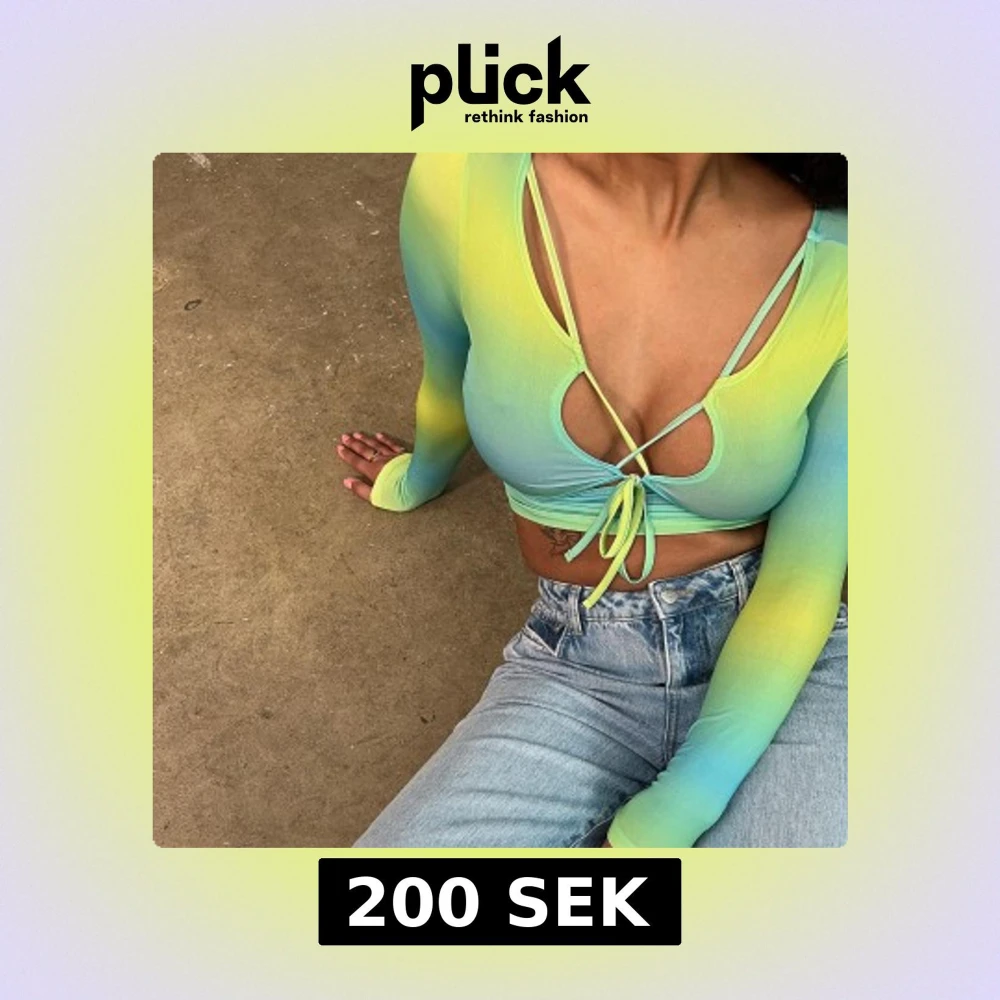 Säljer en croppad långärmad topp från Motel Rocks i blått, grönt och gult. Toppen har knytning framtill, cut-outs och en unik design med smala band över bröstet. Perfekt för dig som vill sticka ut med färg och form!