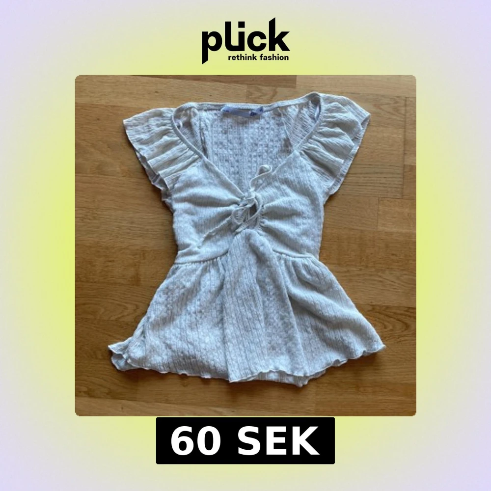 Säljer en söt vit blus med volangärmar och knytning framtill. Blusen har v-ringning och är tillverkad i ett lätt, ribbat material som ger en luftig känsla. Perfekt för varma dagar och enkel att styla. Från lager 157