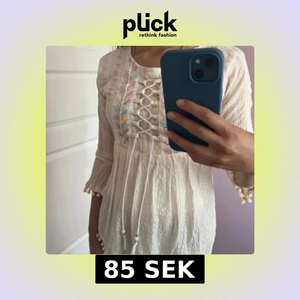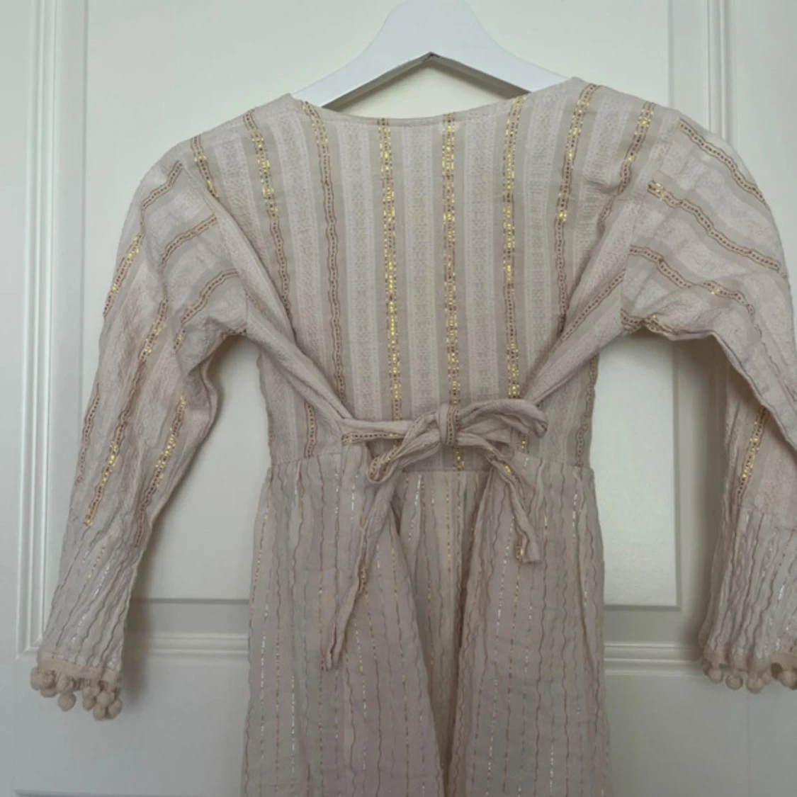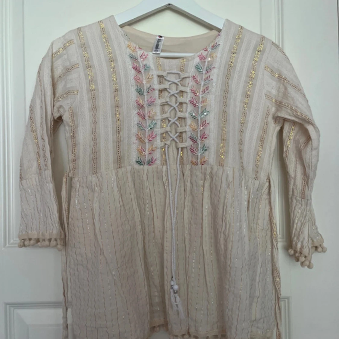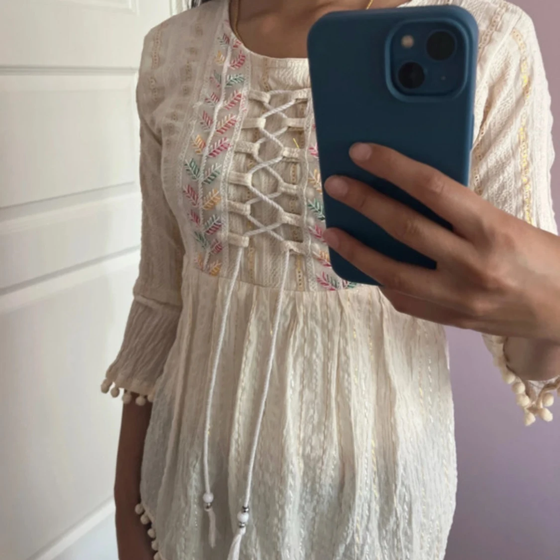 Superfin beige top med broderade detaljer i pastellfärger och snörning framtill. har långärmade ärmar med små bollar vid ärmslut, glittriga ränder och ett knytband i ryggen. Materialet känns lätt och luftigt, perfekt för varma dagar.