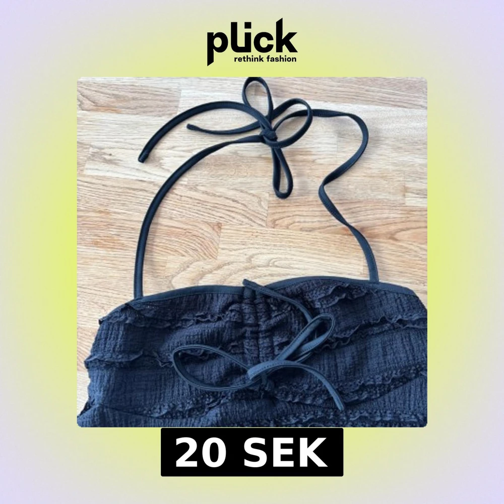 Svart tubtopp från SHEIN med snygga volangdetaljer och knytband i nacken. Toppen har en cool struktur med vågiga rader och är axelbandslös, perfekt för att skapa en trendig look. Materialet känns lätt och luftigt, och toppen är croppad för en modern vibe.