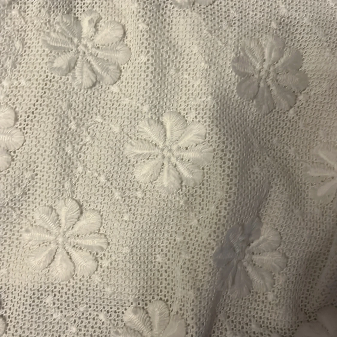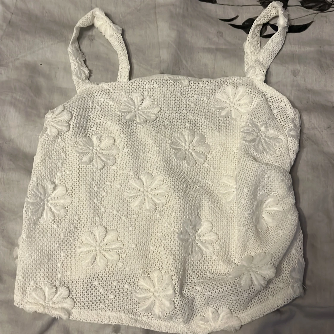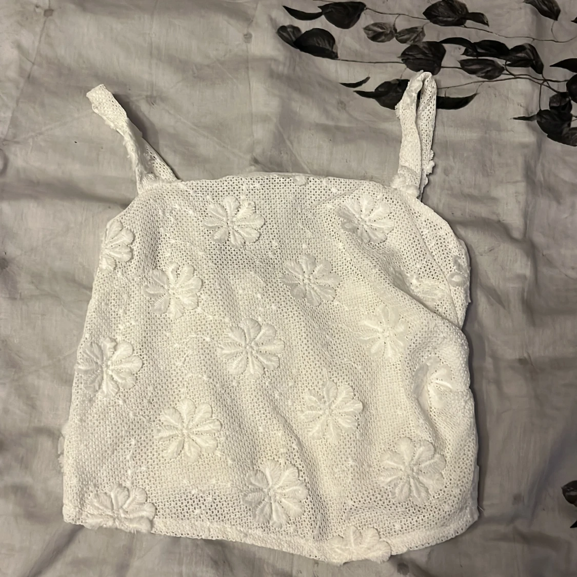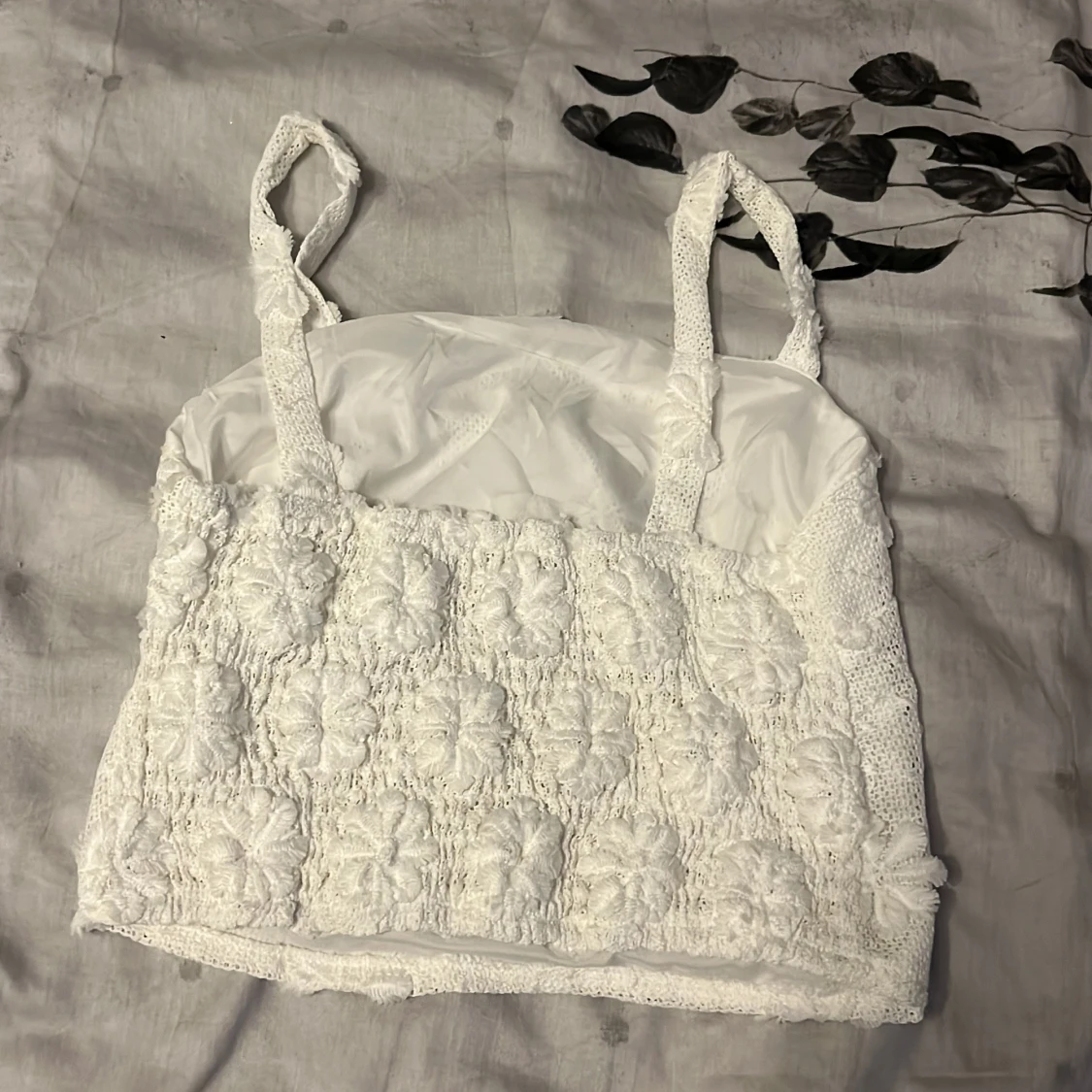 Superfin vit linnetopp med virkade blommor och breda axelband. Toppen har ett genombrutet virkat mönster med broderade blommor över hela och är fodrad på insidan. Perfekt för sommarens alla tillfällen och ger en söt och trendig look.
