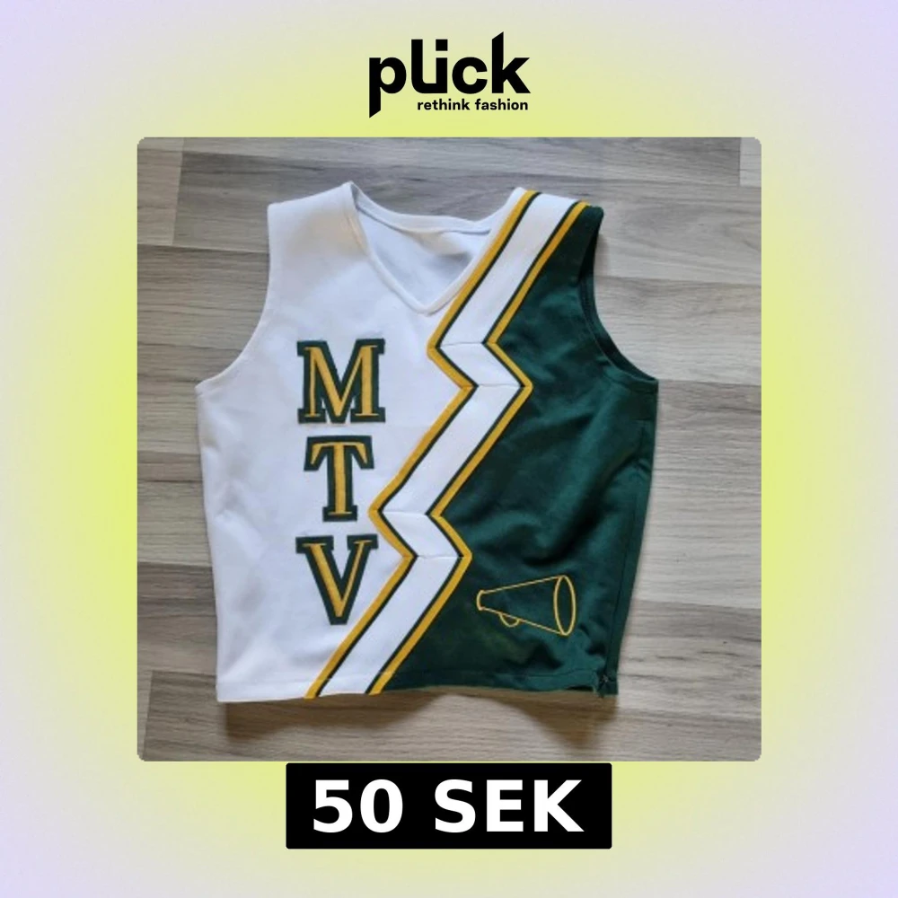Säljer en snygg cheerleader linnetopp från Elite i grönt, vitt och gult. Toppen har ett coolt zigzag-mönster, broderade bokstäver MTV och en megafon på framsidan. V-ringad och ärmlös med dragkedja i sidan. Perfekt för dig som vill sticka ut på träning eller event! Sömmen har släppt på bokstaven M men går lätt att fixa för den händiga 🤗