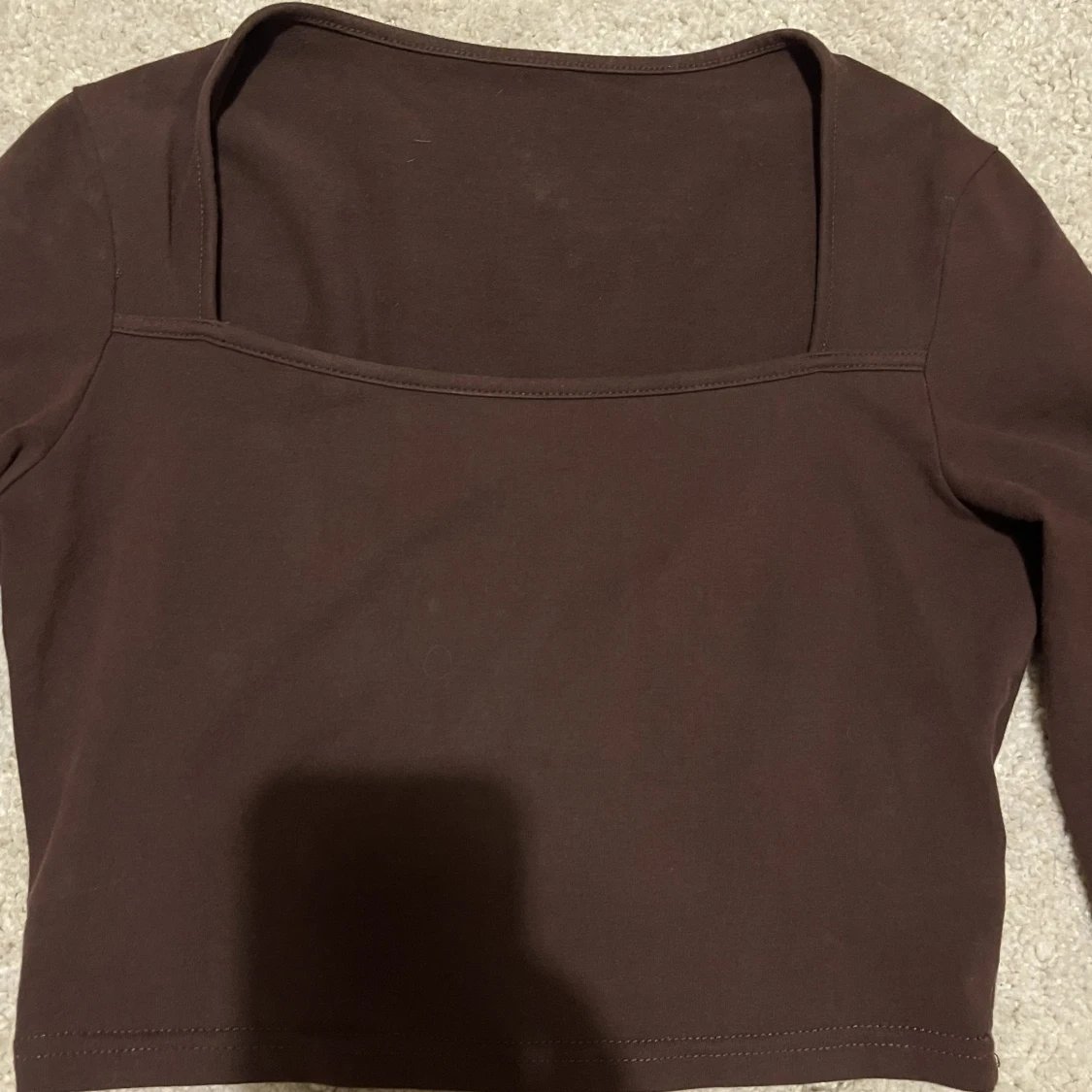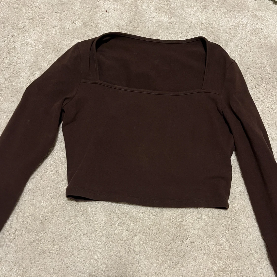 En brun bomullströja med långa ärmar och fyrkantig urringning som framhäver kroppen så snyggt. I strl xs och sitter tight men är väldigt stretchig 😍