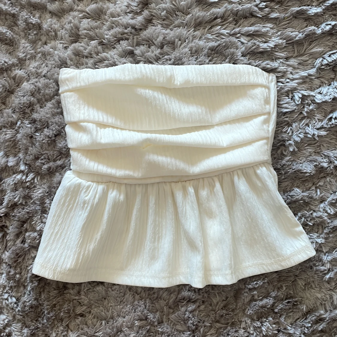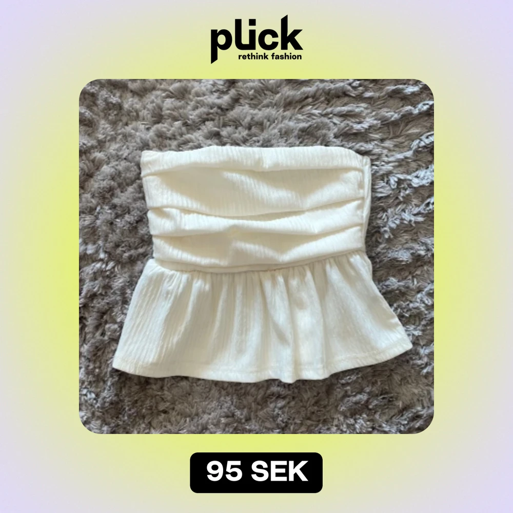 Säljer en superfin vit axelbandslös topp med en smickrande passform. Toppen har en volangdetalj nedtill som ger en söt touch. Perfekt för sommarens alla fester eller en dag på stan. Materialet känns mjukt och bekvämt mot huden.