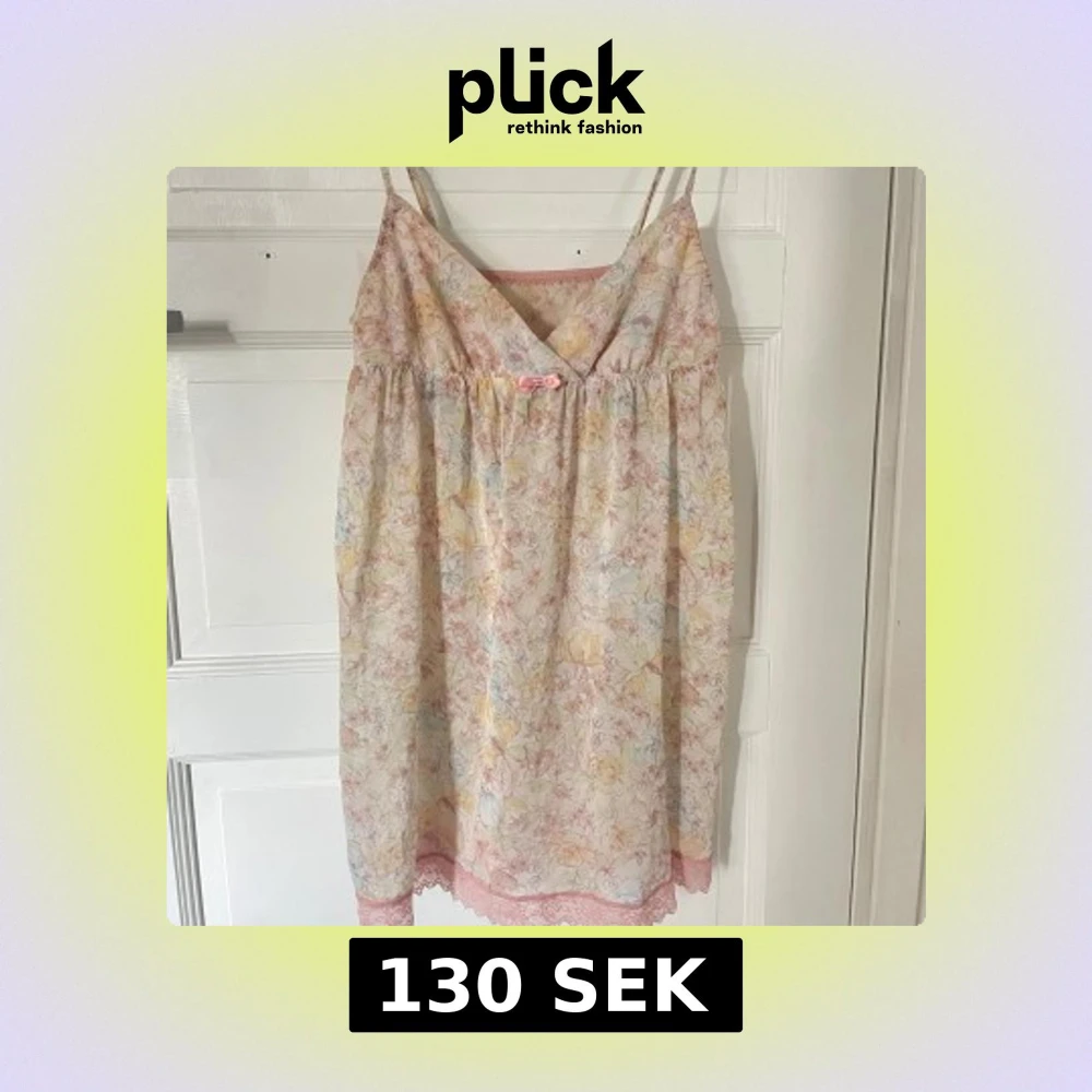 Supergulligt kort nattlinne med tunna axelband och pastelligt blommönster. Klänningen har en liten rosett framtill och spetskant nertill