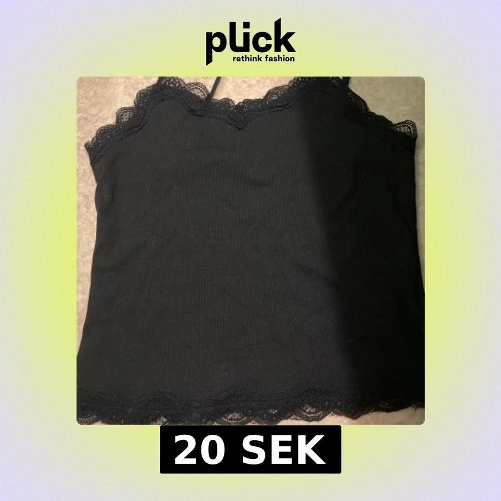 Svart linnetopp med smala axelband och dekorativ spets längs både halsringning och nederkant. Perfekt att styla med jeans eller kjol för en trendig look.