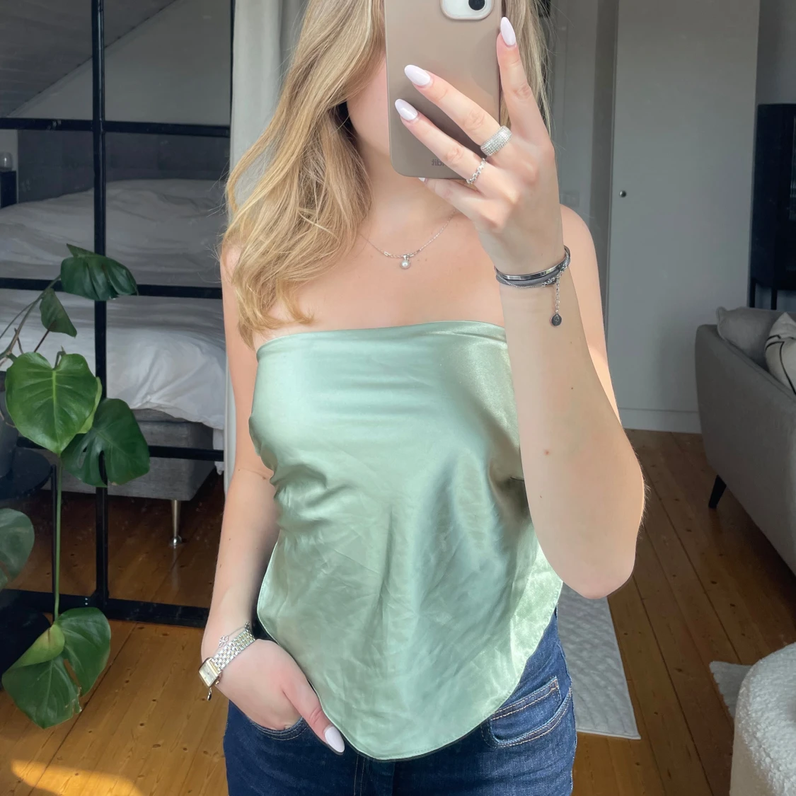 Säljer en ljusgrön satintubtopp från ASOS. Toppen är axelbandslös och har smala knytband i ryggen. Superfin till sommaren🪩🥂