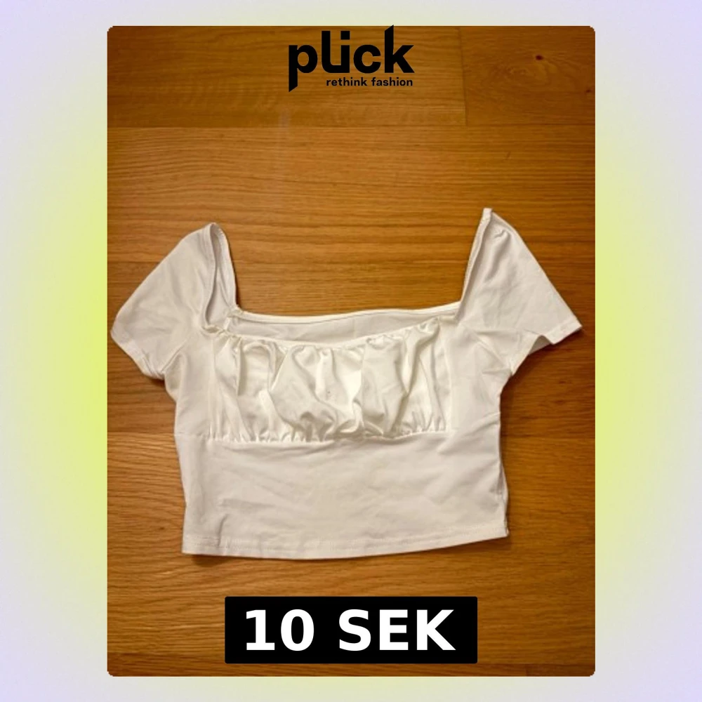 Säljer en vit croppad topp från SHEIN i storlek XS Petite. Toppen har korta ärmar, fyrkantig halsringning och snygga rynkade detaljer framtill. Materialet är mjukt och stretchigt, perfekt för dig som gillar en slim passform och stilren look. 90% Polyester, 10% Elastan