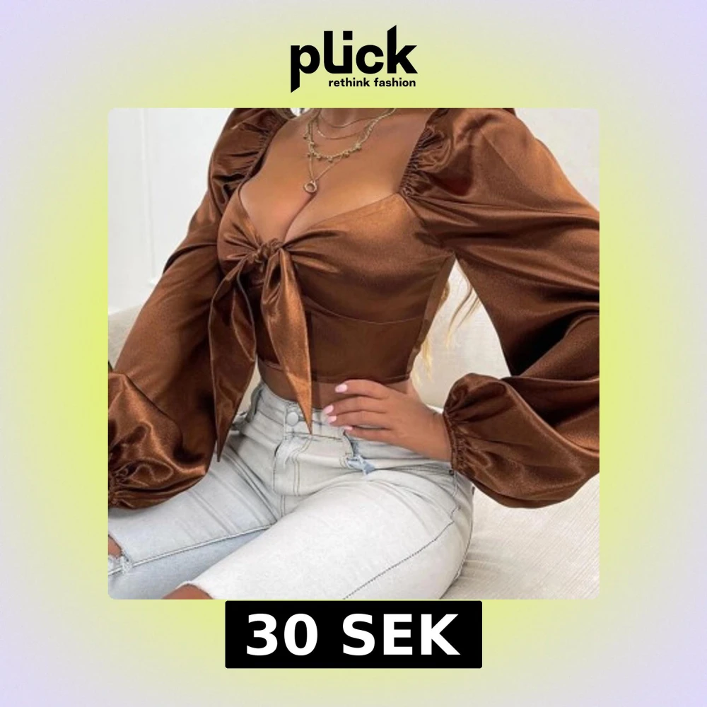 Elegant brun blus i satin med knyt framtill. Blusen har långa ärmar och en glansig finish som ger en lyxig känsla. Perfekt för en stilfull look.