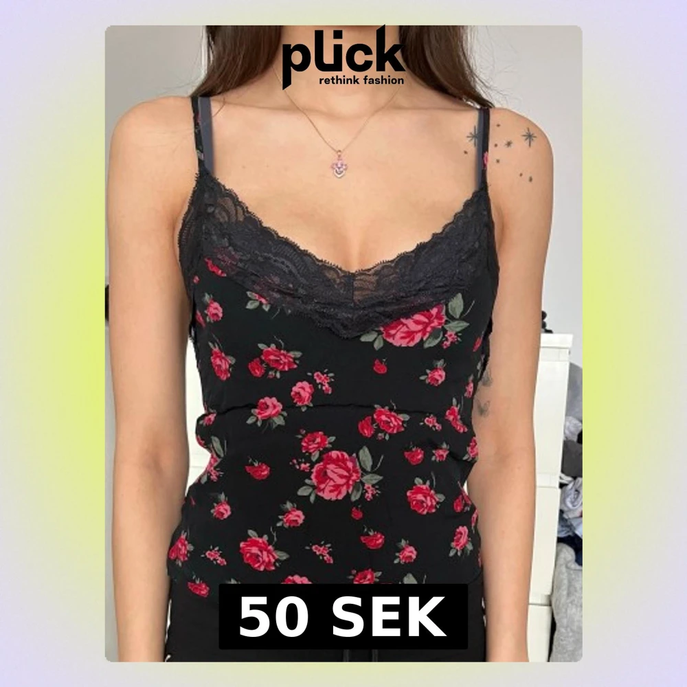 Snygg svart linnetopp med röda rosor och grönbladigt blommönster. Toppen har tunna axelband och v-ringad spetskant framtill som ger en romantisk vibe. Perfekt att styla med jeans eller kjol för en trendig look.