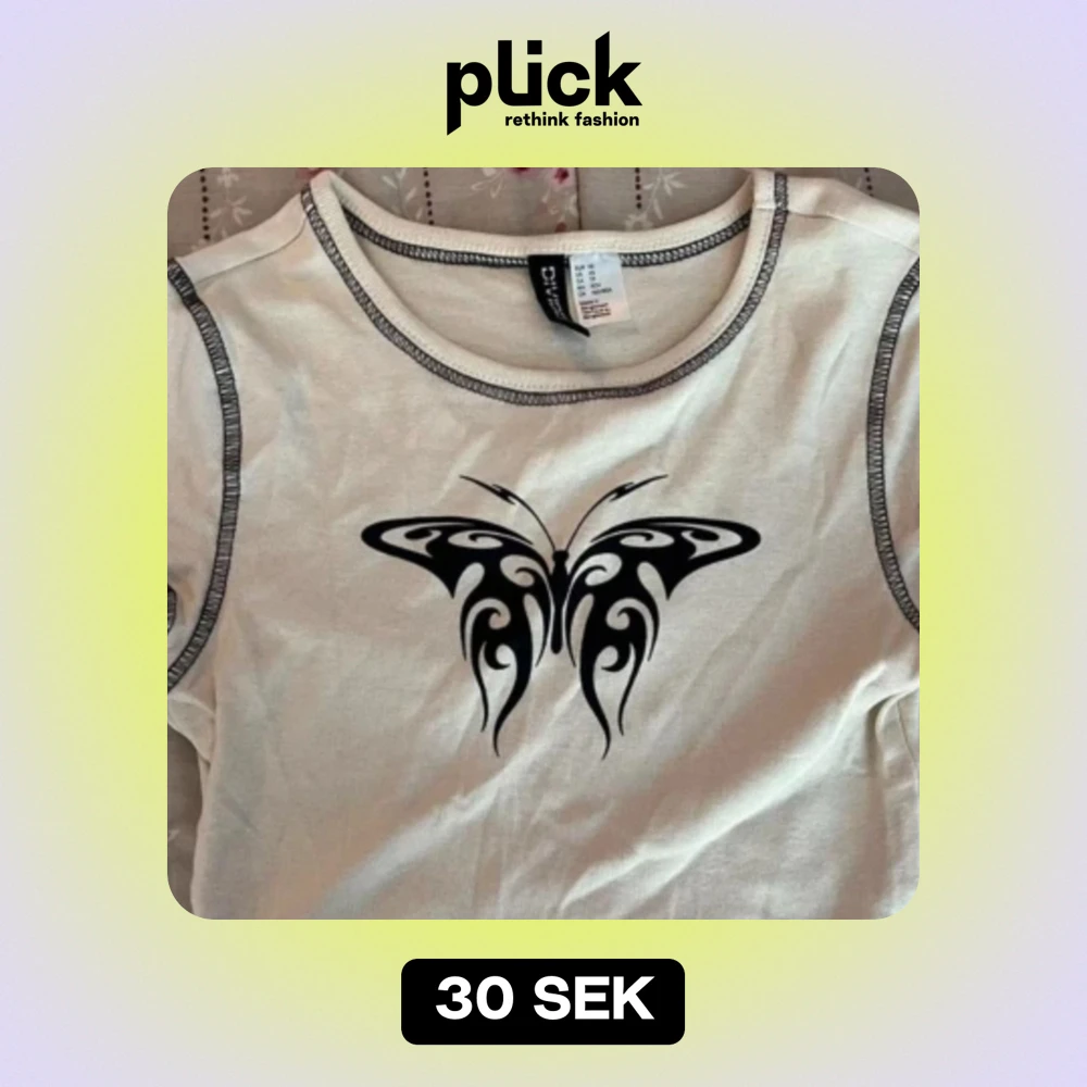 Säljer en vit t-shirt från Shein med ett coolt svart fjärilstryck på framsidan. T-shirten har korta ärmar och kontrastsömmar i svart som ger en extra touch. Perfekt för vardagsbruk eller en avslappnad dag ute. 🦋