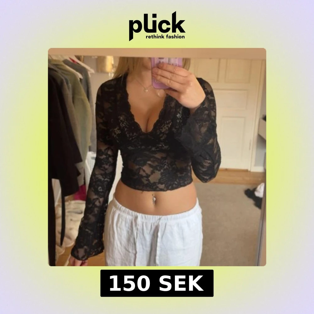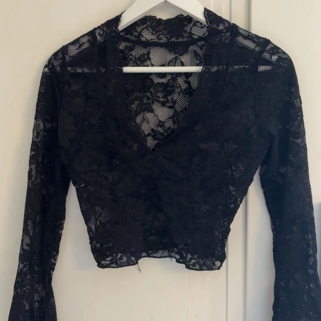 Säljer en svart croppad topp i genombruten spets med v-ringning och långa ärmar. Toppen har ett blommigt spetsmönster och är figurnära med snygg passform. Perfekt för att lyfta en outfit med lite extra edge.