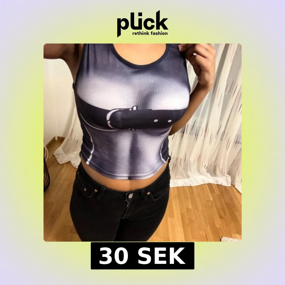 Snyggt svart och vitt linne med ett unikt tryck som ser ut som ett bälte runt brösten. Jätte fin till sommaren, funkar med svarta, vita och blåa jeans. Linnet är ärmlöst och har en rund halsringning.