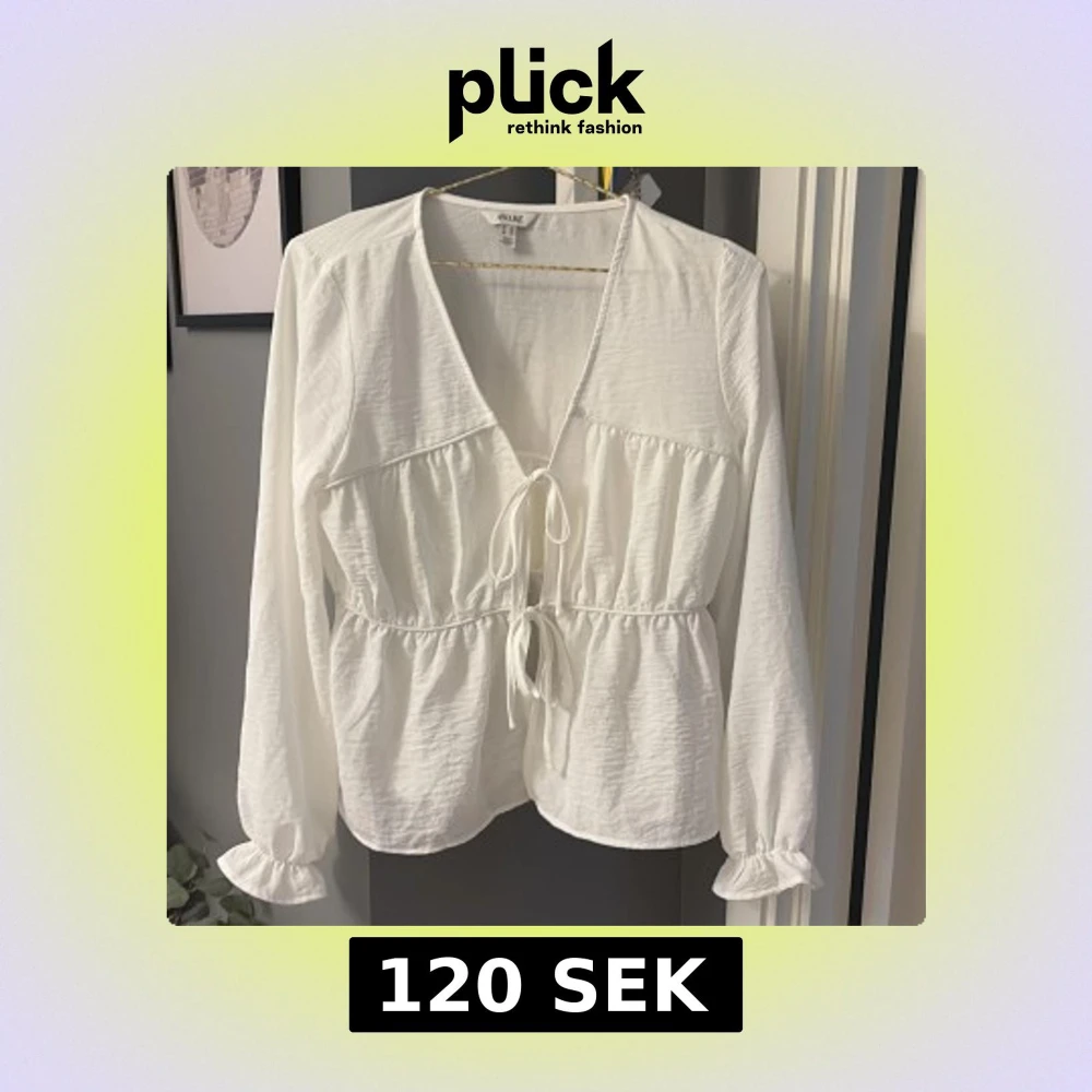 Säljer en vit blus från AWARE med v-ringning och knytning framtill. Blusen har långa ärmar med resår vid ärmslut och en lätt rynkad midja för en feminin siluett. Perfekt till vardags och till lite mer festligare.