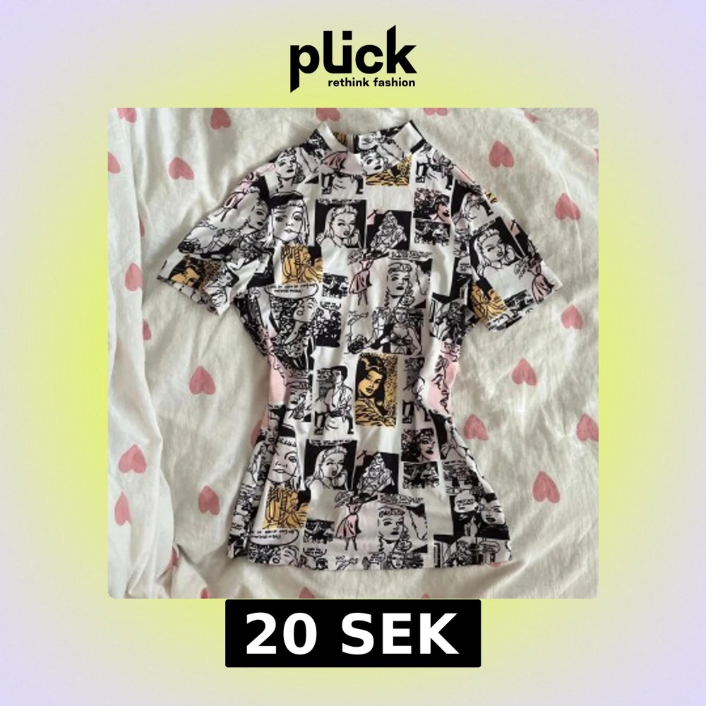 En polotopp från SHEIN i strl XS med korta ärmar och ett unikt comic-mönster i svart, vit, rosa och gul. Toppen har en slim passform och är gjord i mjuk polyester. Perfekt för dig som gillar statement-plagg och grafiska prints!💞 OBS: Orden är påhittade