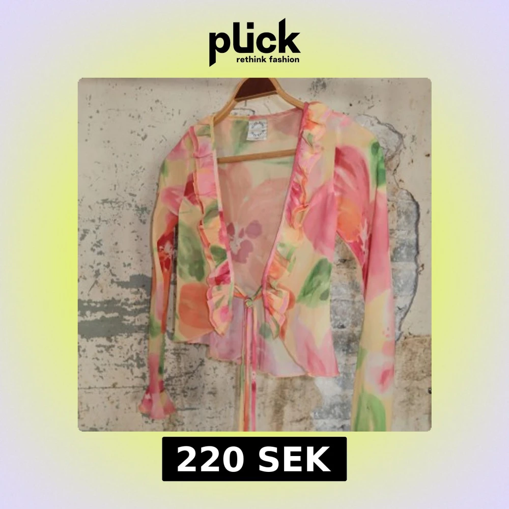 Superfin blus i transparent material med stora blommor i rosa, orange, grön och gul. Djup v-ringning med volangkant och knytband framtill. Långärmad och lätt croppad modell, perfekt för en färgglad look.