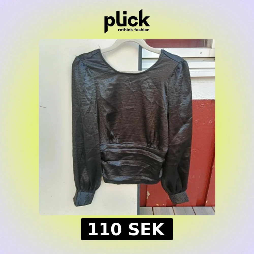 Snygg svart blus i glansigt material med lång ärm och bred smockad midja. Djup v-ringning i ryggen och knappar vid ärmslut. Perfekt för dig som gillar stilrena och trendiga plagg med en twist.