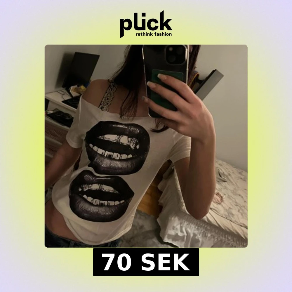 Säljer en cool vit offshoulder t-shirt med ett stort tryck av svarta läppar. Perfekt för en avslappnad stil med en twist. T-shirten har en lös passform och är superbekväm att bära.