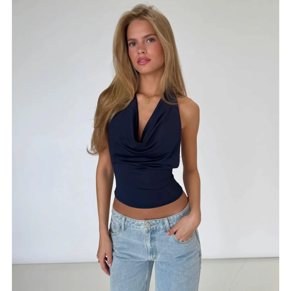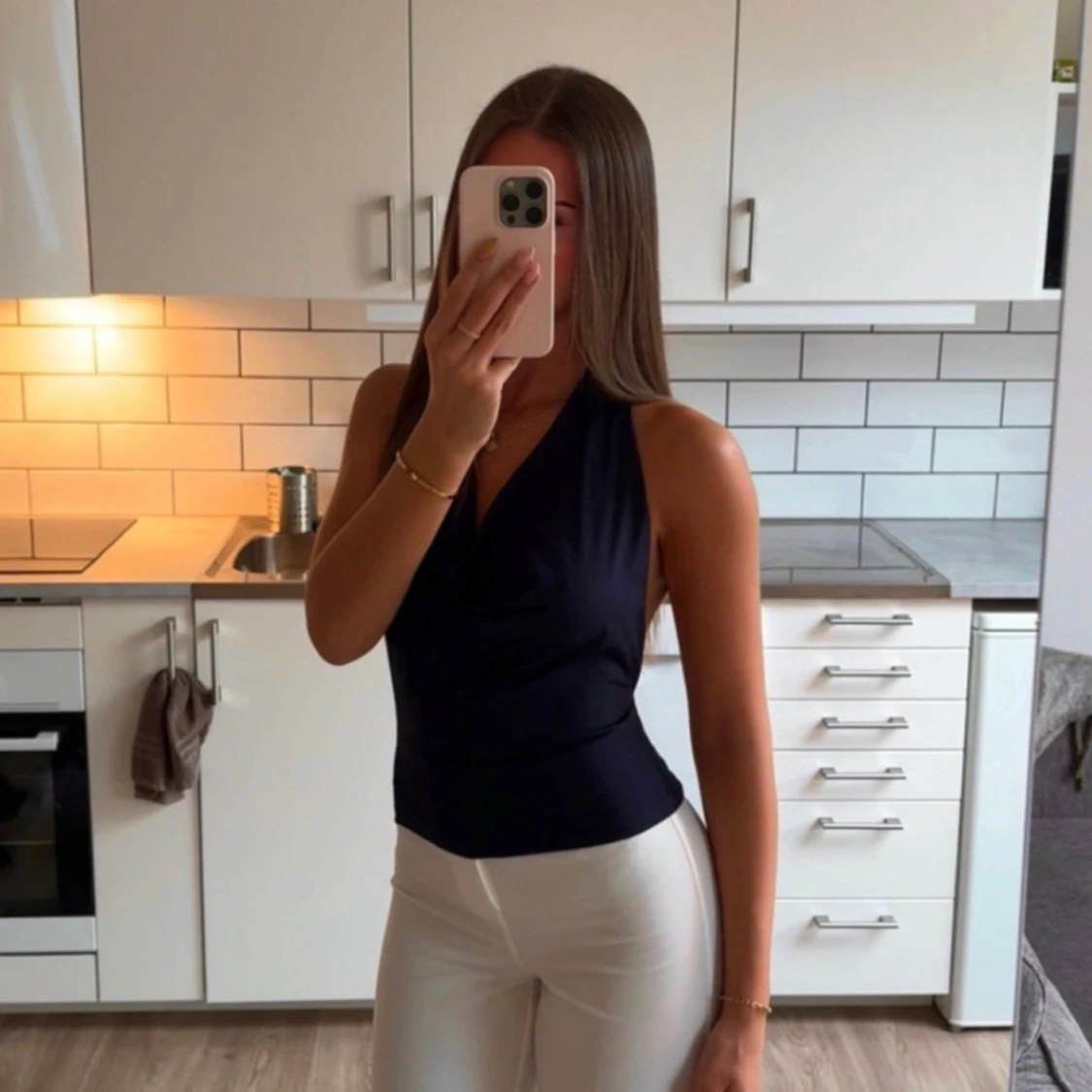 Slutsåld mörkblå halterneck topp från Venderbys. Wave top. Köpt för 400kr. Storlek XS-S. Använd 2 gånger, nyskick💗