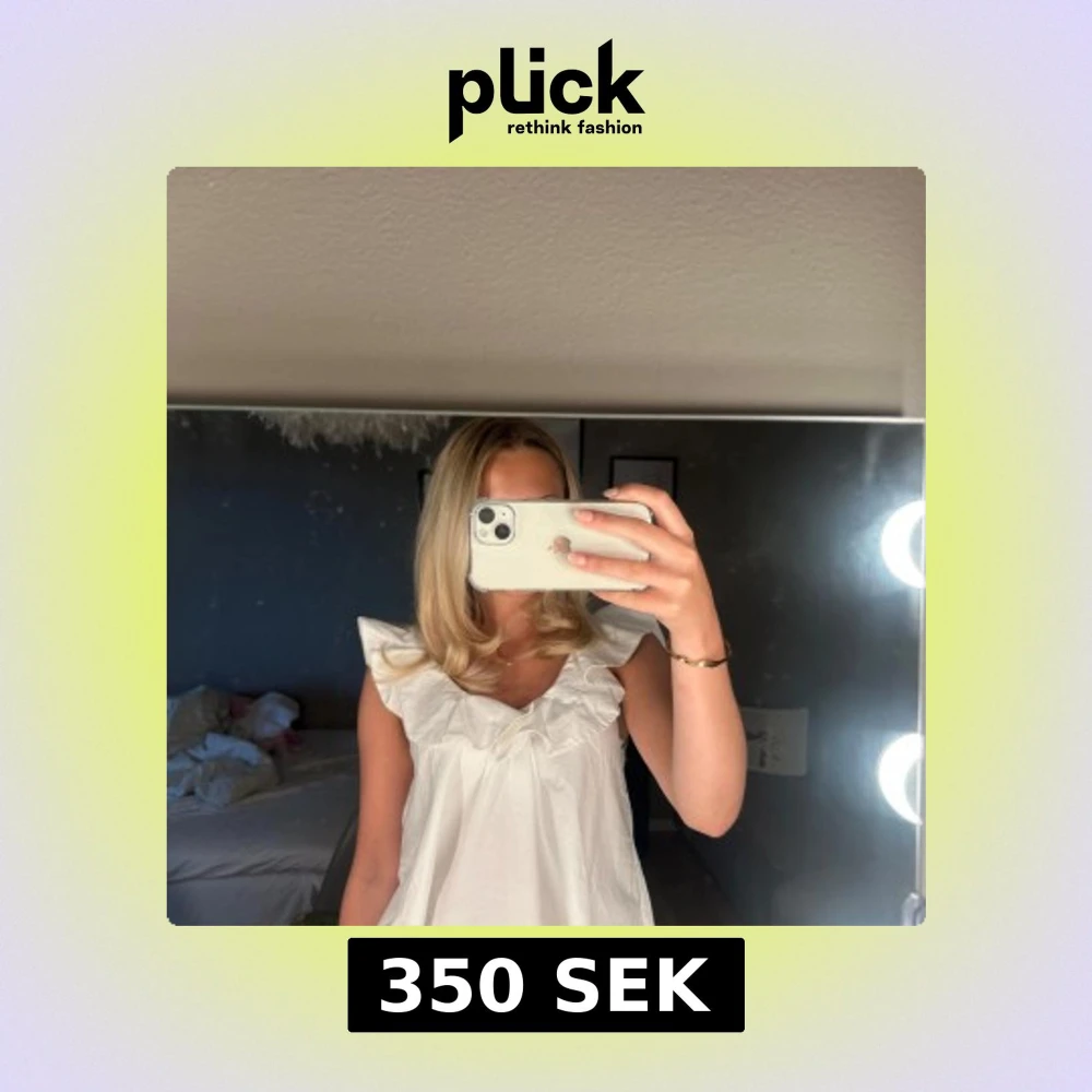 Supersöt vit blus med bred volangkrage och ärmlös design. Luftig passform och lätt material, perfekt för varma dagar. Blusen har en feminin v-ringning och volangdetaljer som ger en romantisk vibe. Snygg att styla med jeans eller kjol.