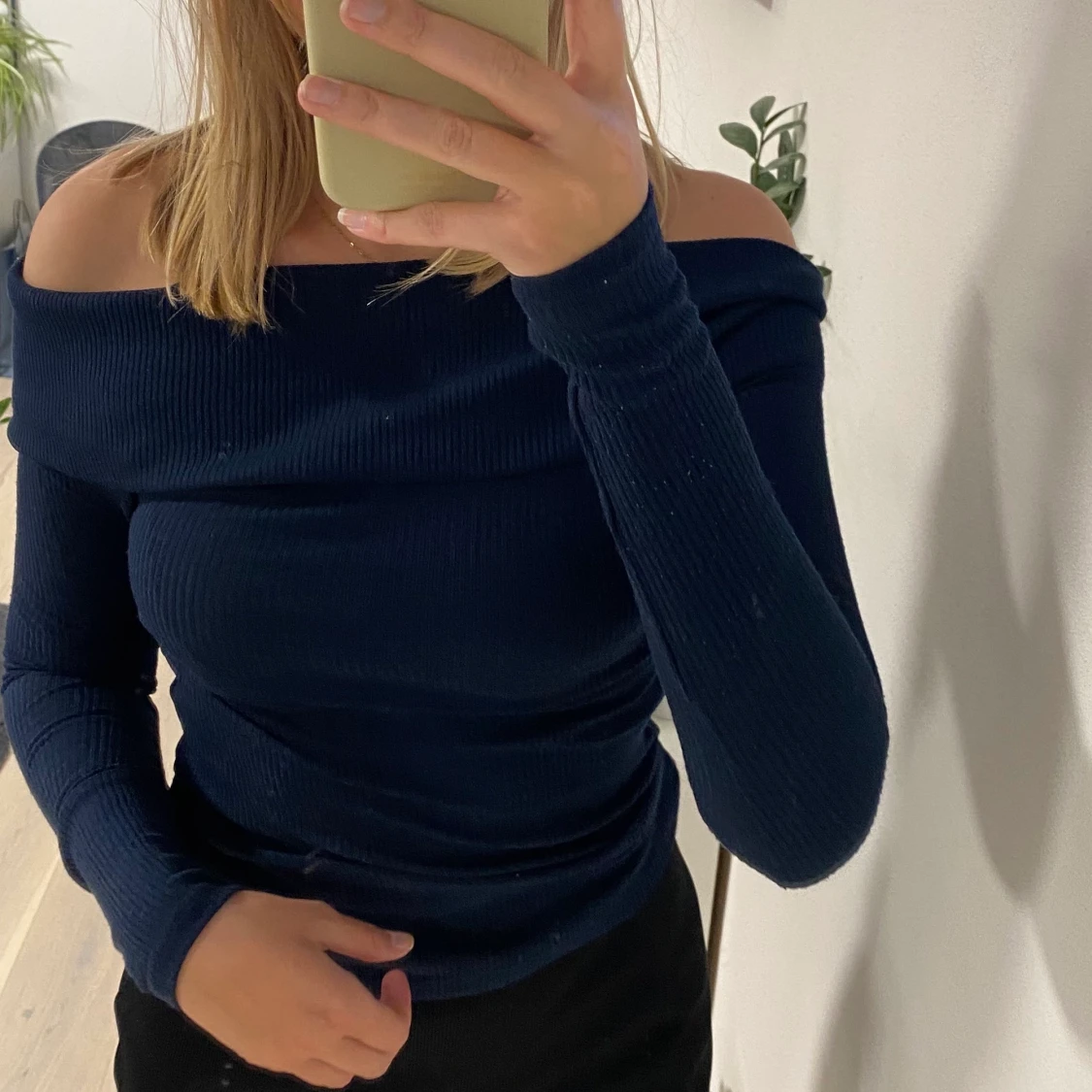 Söt marinblå offshoulder tröja i strl Xs från Gina. Stretchigt material💕