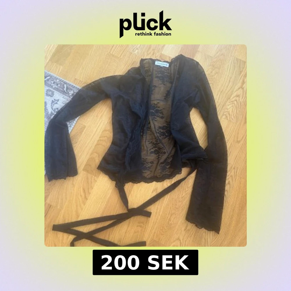 Säljer en svart transparent omlottopp från Venderby's i spets med blommigt mönster. Toppen har långa ärmar, croppad passform och knytband i midjan.