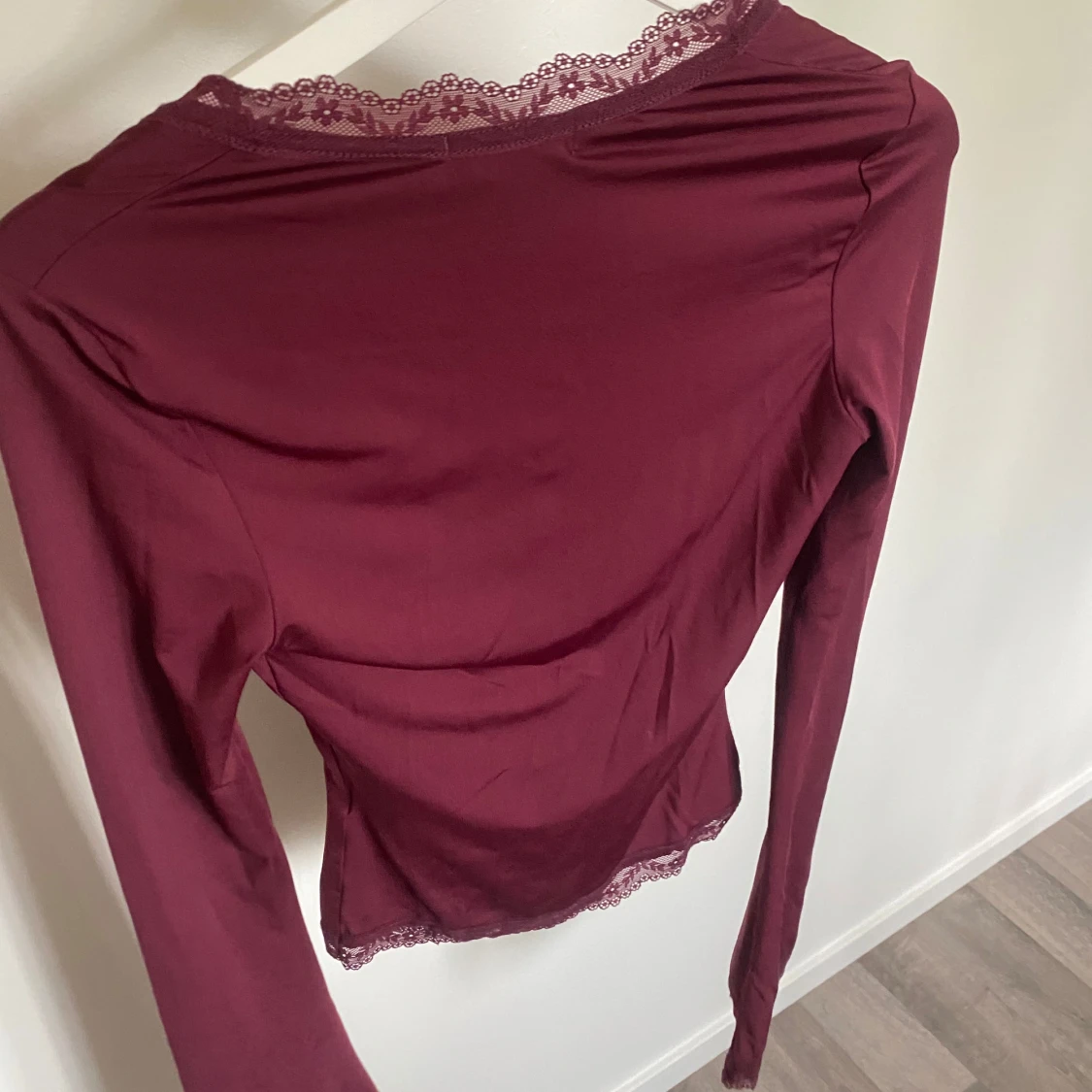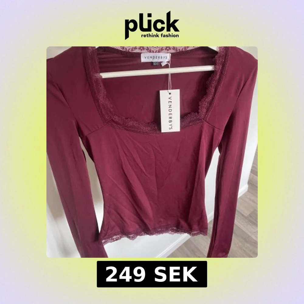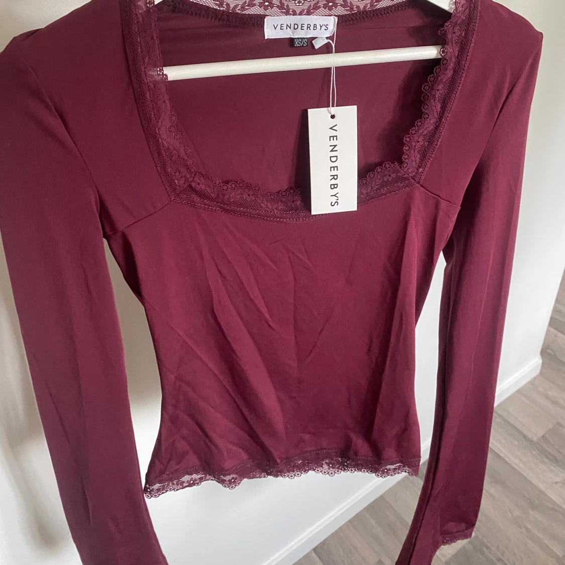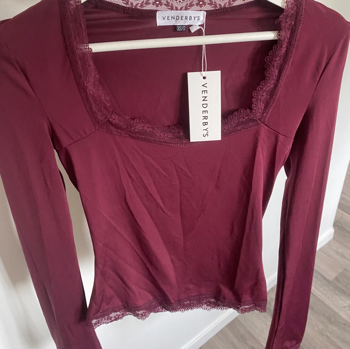 Supersnygg vinröd långärmad topp från Venderby’s med spetsdetaljer vid halsringning och nederkant. Figurnära passform och fyrkantig urringning ger en trendig vibe. Perfekt att styla med jeans eller kjol för en cool look.