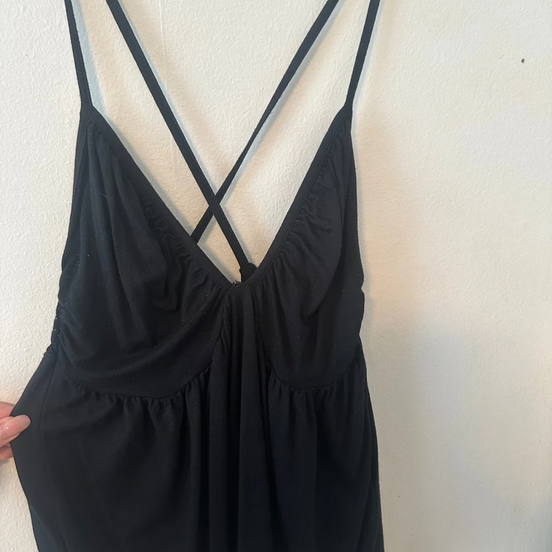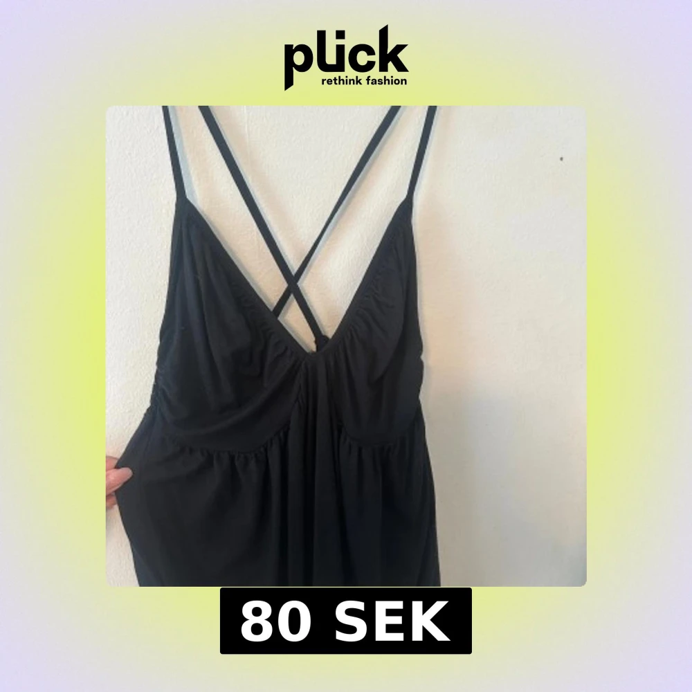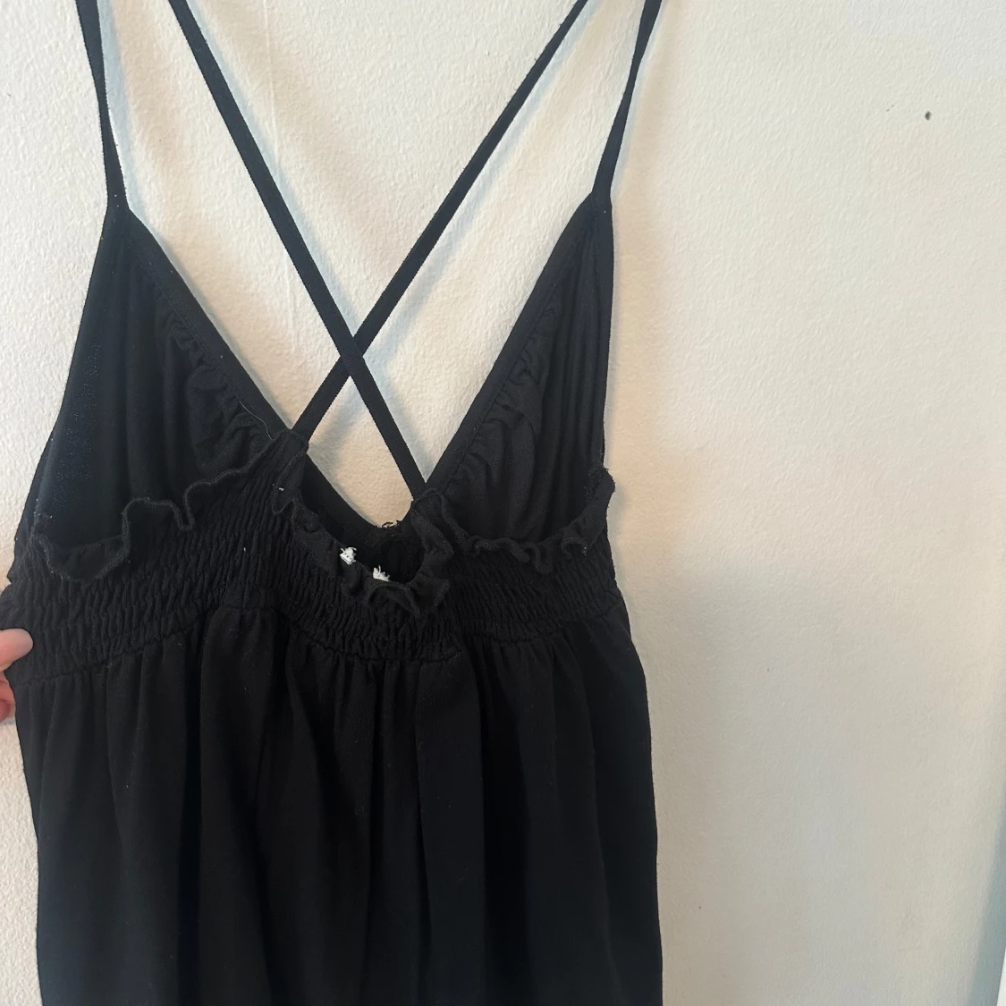Säljer ett svart linne med smala korsade axelband i ryggen och djup v-ringning. Linnen har en lätt rynkad byst och resår i ryggen för extra komfort. Perfekt för varma dagar eller sommarens tillfällen.