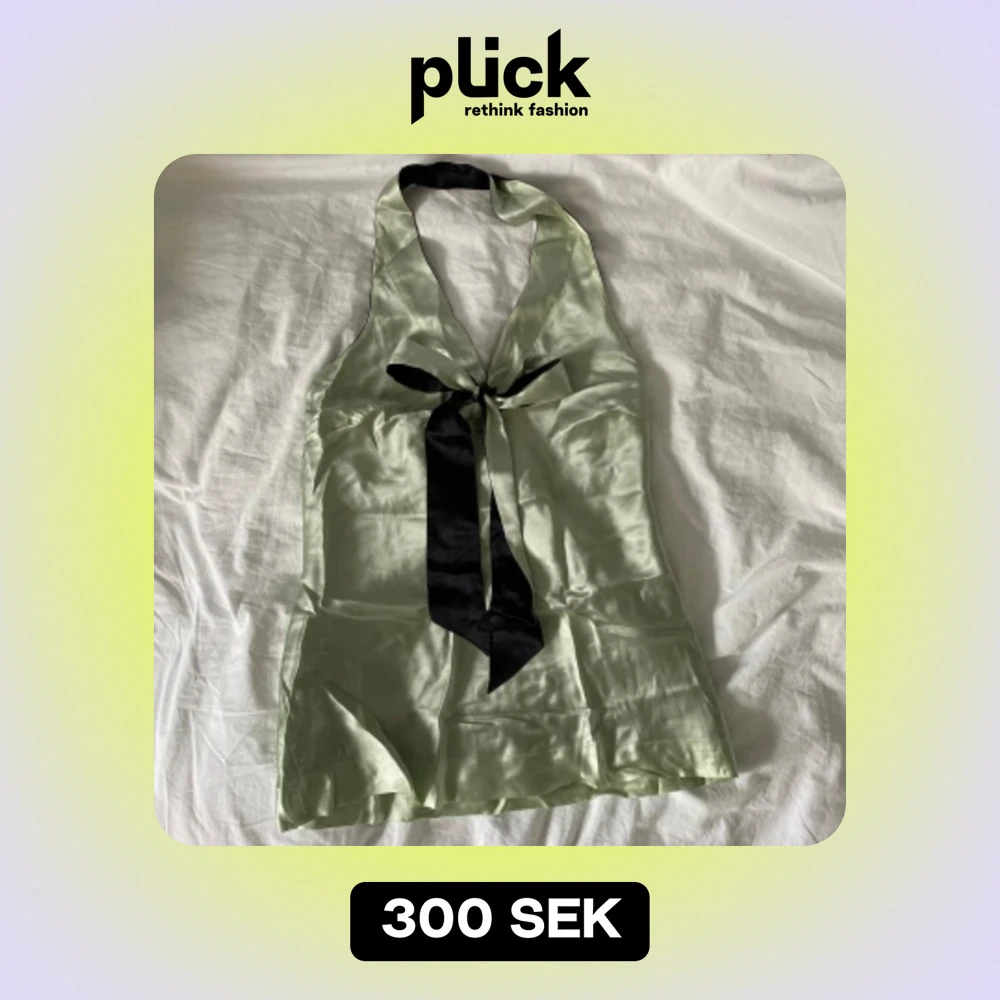 Halternecktopp med knytband framtill, går att bära antingen den svarta sidan ut eller den ljusgröna. En pytteliten defekt precis i v-ringningen som går att sy ihop. Inget märke eller storlek men skulle säga att den passar XS-S