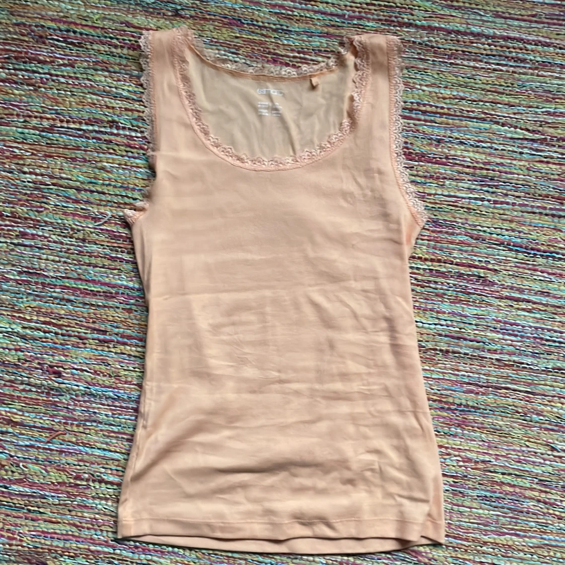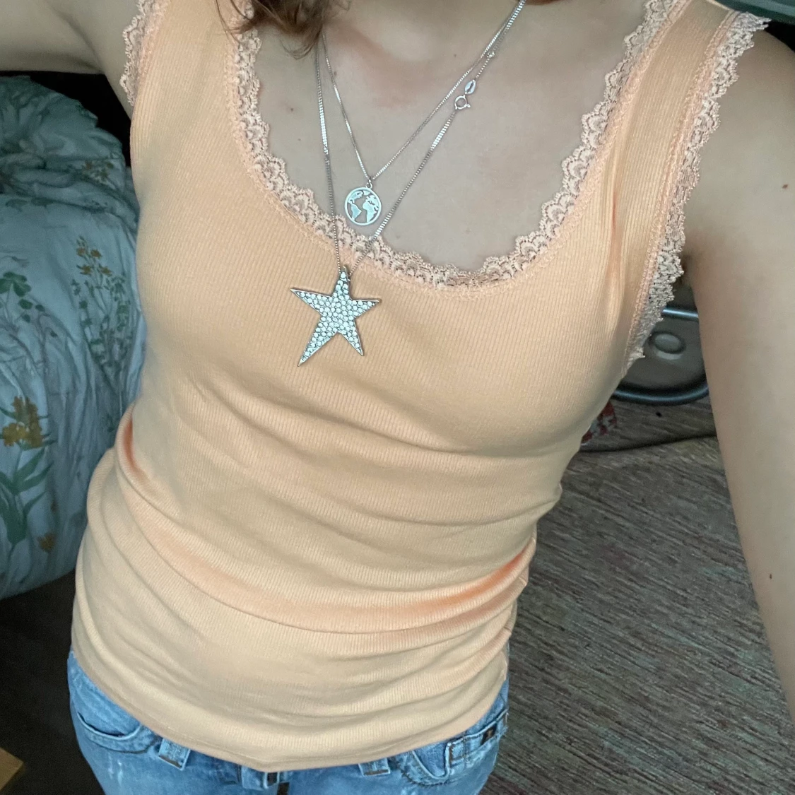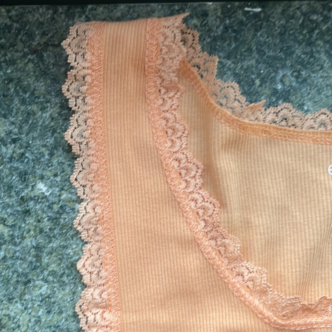 Jättefint spetslinne i pastelorage färg. Aldrig använt. Storlek XS.