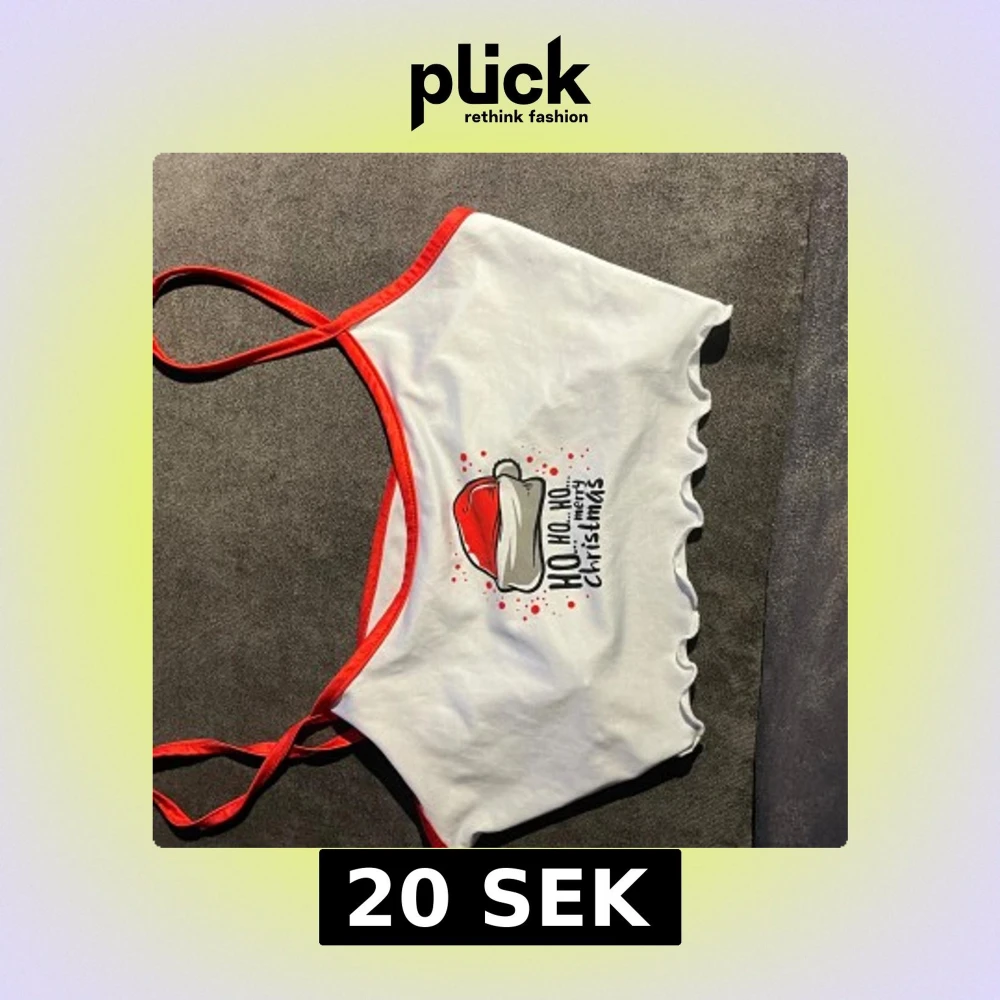 Säljer en vit croppad linnetopp med röda kantband och smala axelband. Framsidan har ett tryck med tomteluva och texten 'Ho Ho Ho Merry Christmas'. Toppen har vågig volangkant nedtill och är perfekt för julens alla tillfällen.