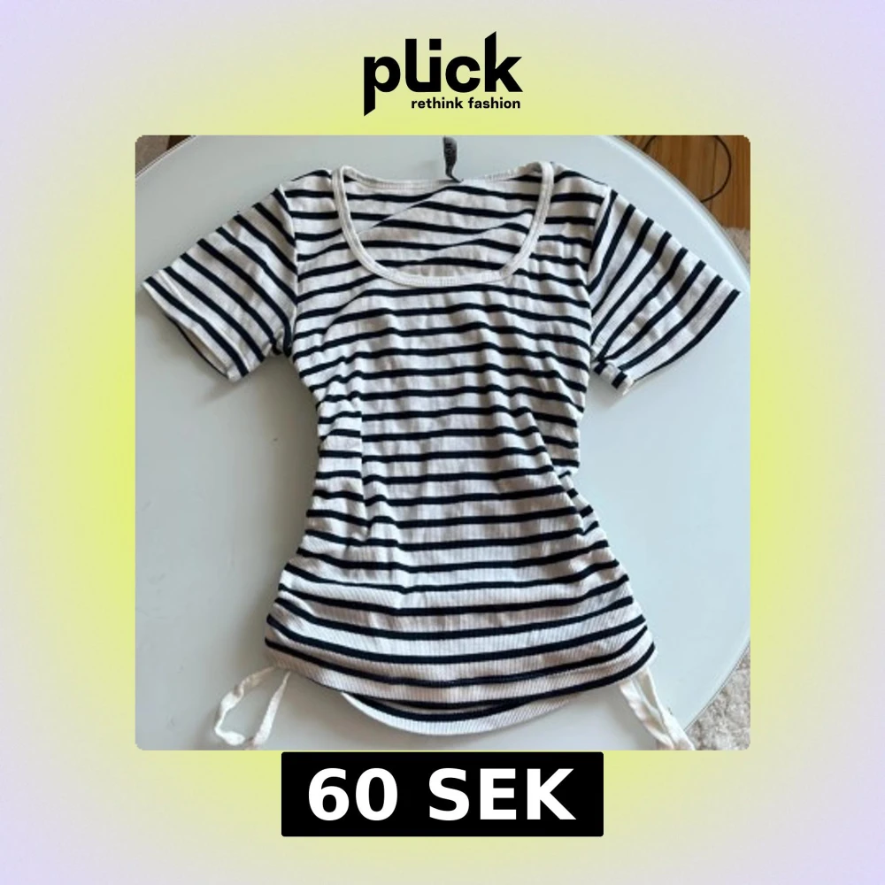 Superfin ribbad topp i vitt och marinblått med horisontella ränder. Modellen har snygga knytband i sidorna för en cool rynkad effekt. Köptes i Turkiet. Står S-M på bilden men passar Xs