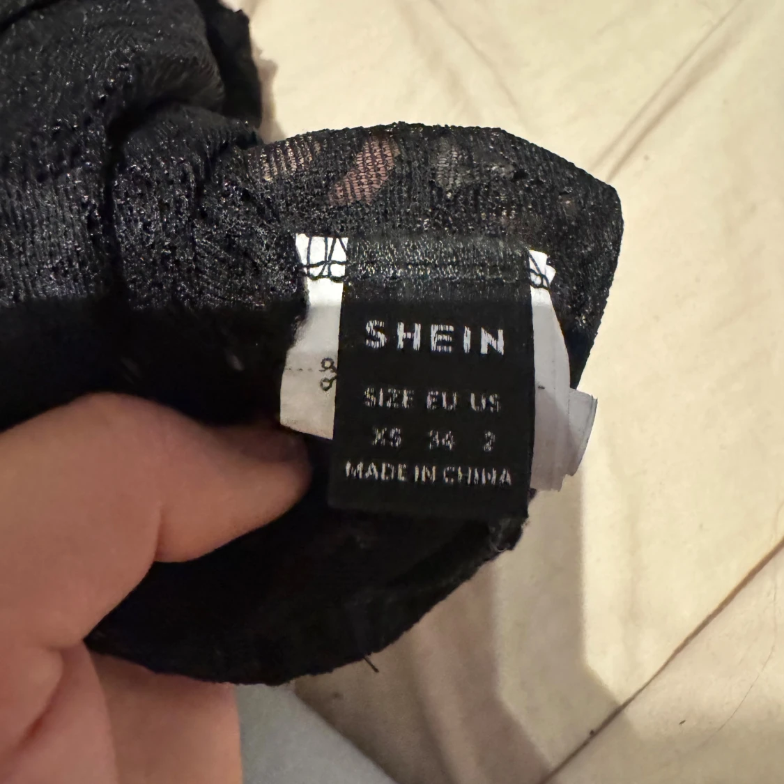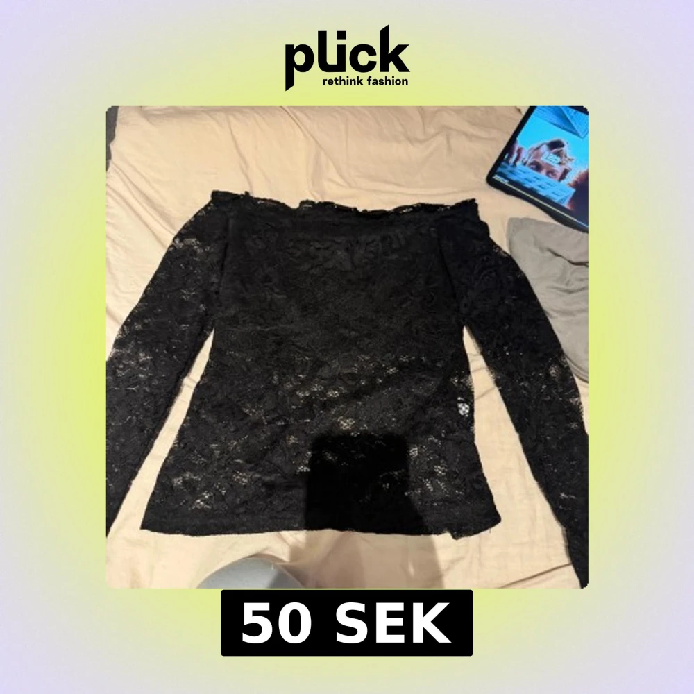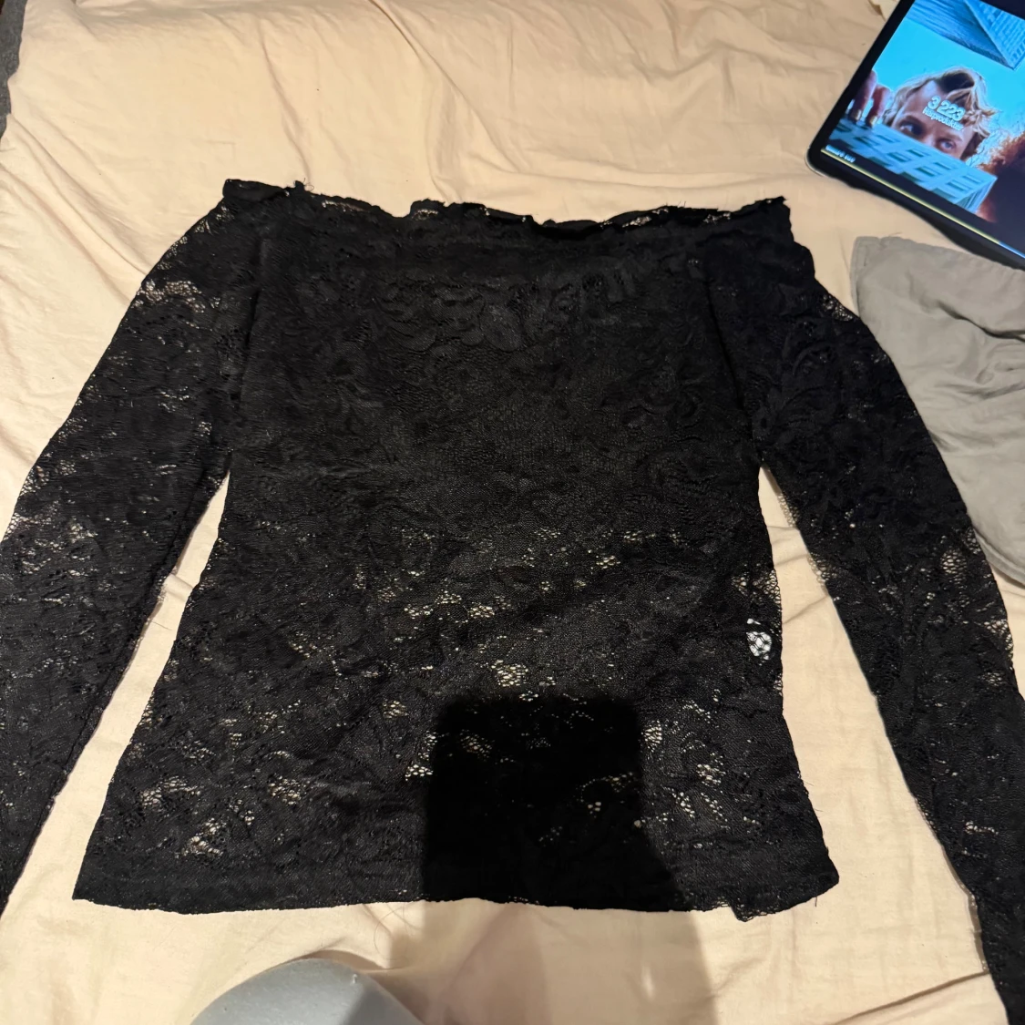 Svart långärmad blus från SHEIN i genombruten spets med blommigt mönster. Offshoulder-modell med smal passform och transparent känsla. Perfekt för dig som gillar detaljer och vill sticka ut lite extra.