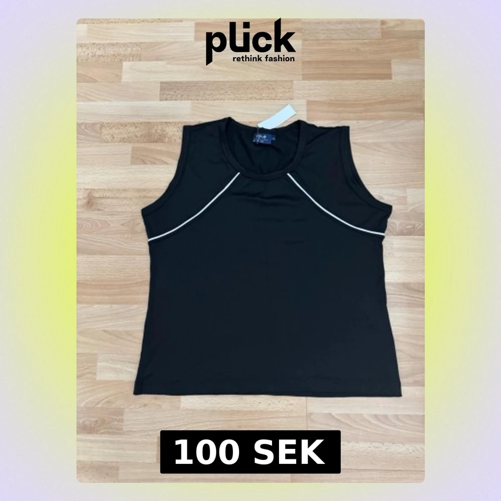 Snygg svart linnetopp med vit piping längs bröstet. Toppen är ärmlös och har en rund halsringning. Perfekt för en clean och sportig look. Materialet känns mjukt och stretchigt. Bröst 110cm