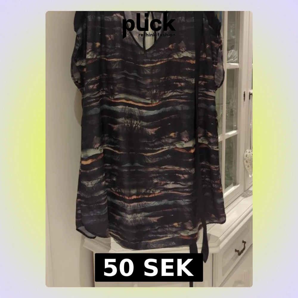 Säljer en luftig blus med mörkt abstrakt mönster i svart och inslag av beige,orange. Blusen har v-ringning, korta ärmar och ett knytband i midjan för snygg passform. Perfekt för dig som gillar unika prints och avslappnad stil.
