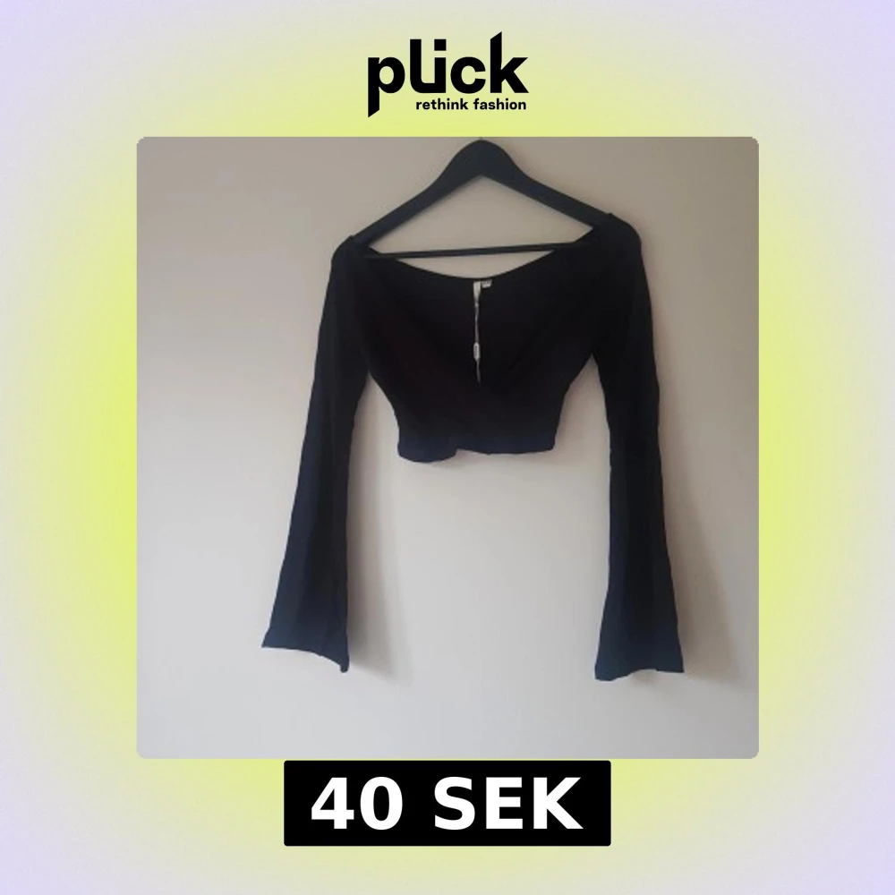Snygg svart croppad omlottopp från NLY Trend med långa utsvängda ärmar och djup v-ringning. Toppen har en stilren och trendig look som passar perfekt till höga jeans eller kjol. Mjuk och stretchig känsla för en bekväm passform. Ny med lapp så inget att anmärka på