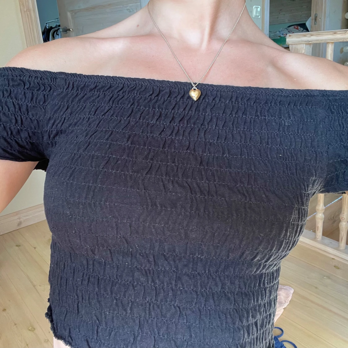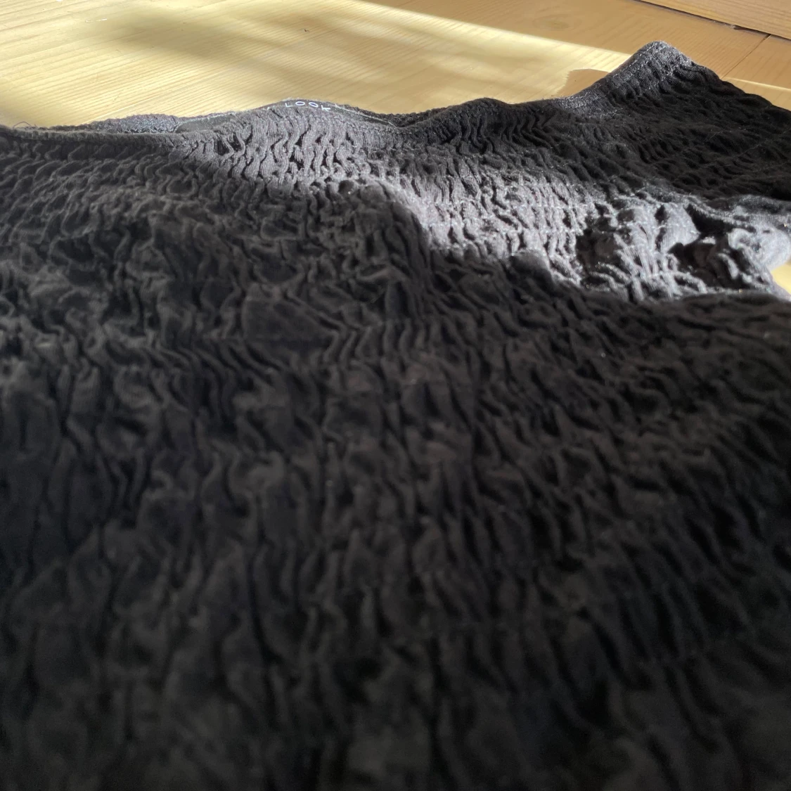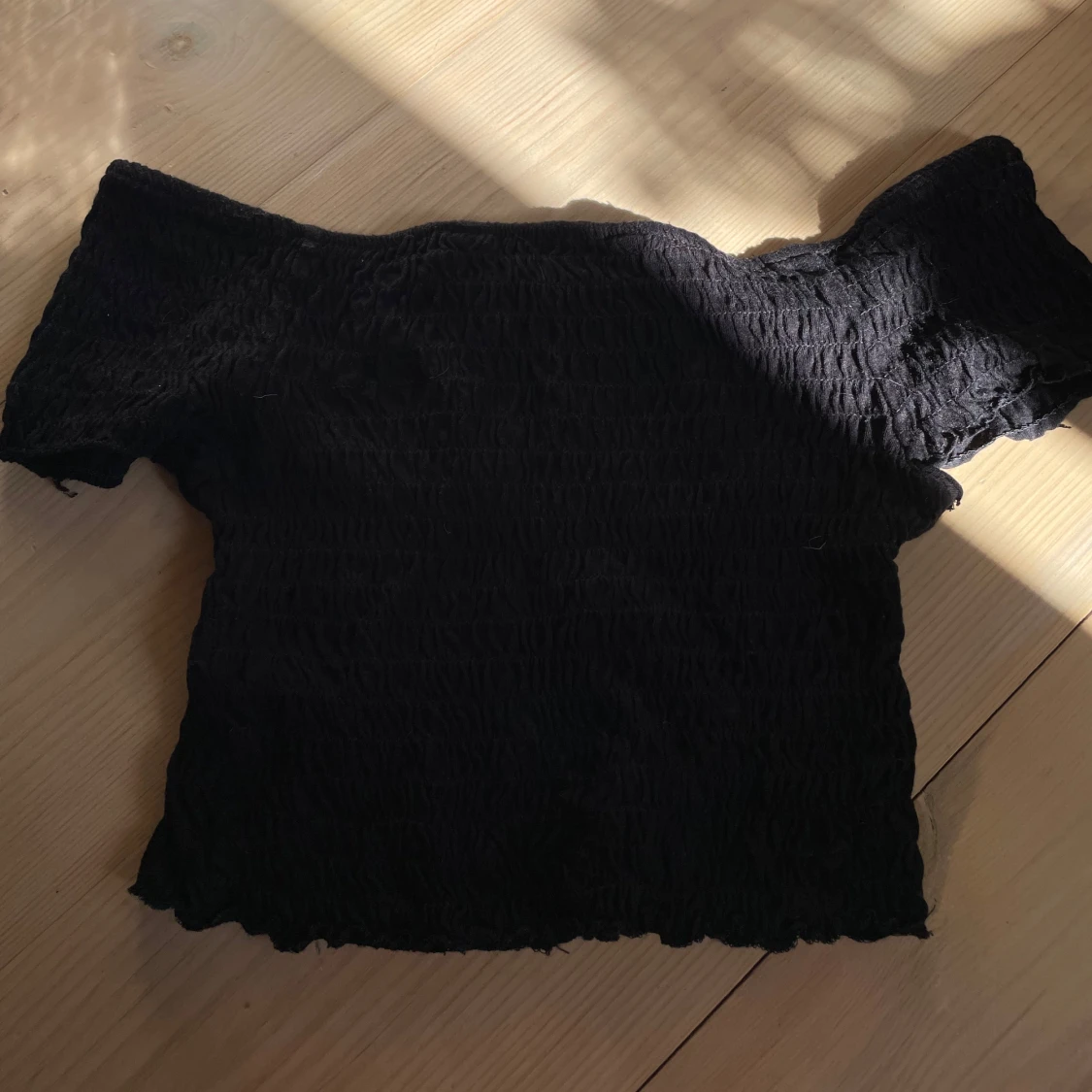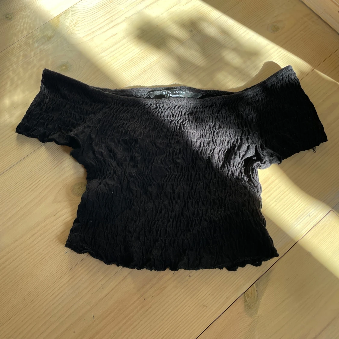 Säljer en svart croppad topp från New Look med offshoulder-modell. Toppen har smockad struktur över hela tyget och enkel och stilren. Står storlek 140-146, skulle snarare säga kring xs-xxs
