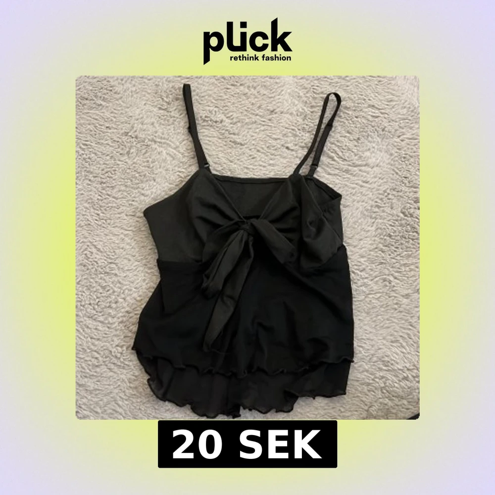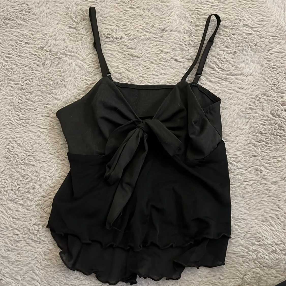Snygg svart linnetopp med tunna axelband och stor rosett framtill. Toppen har ett flowigt, dubbellager tyg med vågig kant nedtill som ger en cool look. Perfekt för att lyfta din outfit med lite extra stil.