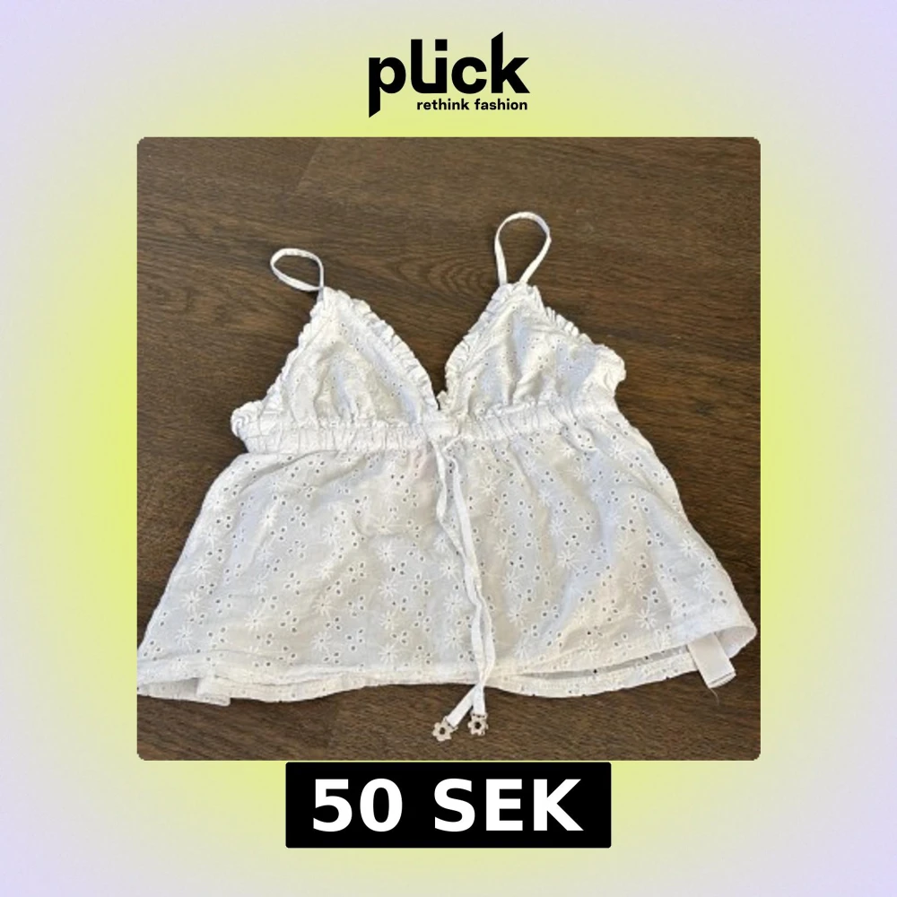 Supersöt vit linnetopp från Censored med smala axelband, v-ringning och volangkant. Toppen har broderade blommor, knyt i midjan och är lätt croppad. Perfekt för varma dagar