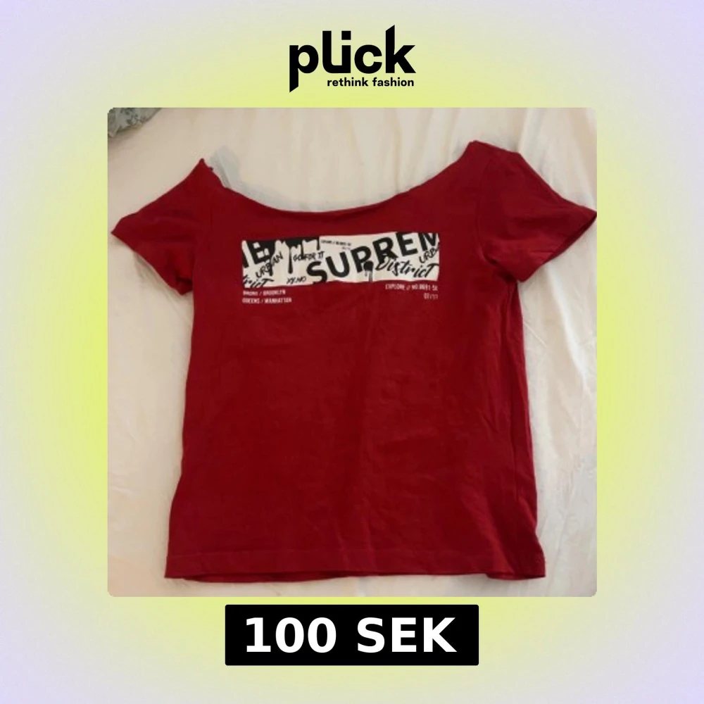 Säljer en röd offshoulder topp från Suprem District med korta ärmar och ett stort vitt och svart tryck framtill. Toppen har en cool urban vibe med text och grafiska detaljer. Perfekt för dig som gillar streetstyle och vill sticka ut.