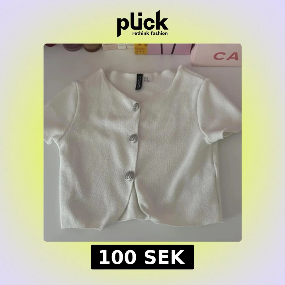 Superfin vit kortärmad topp från H&M Divided med tre silvriga knappar framtill. Modellen är croppad och har en lätt struktur i tyget. Perfekt för dig som gillar en enkel men ändå snygg look.
