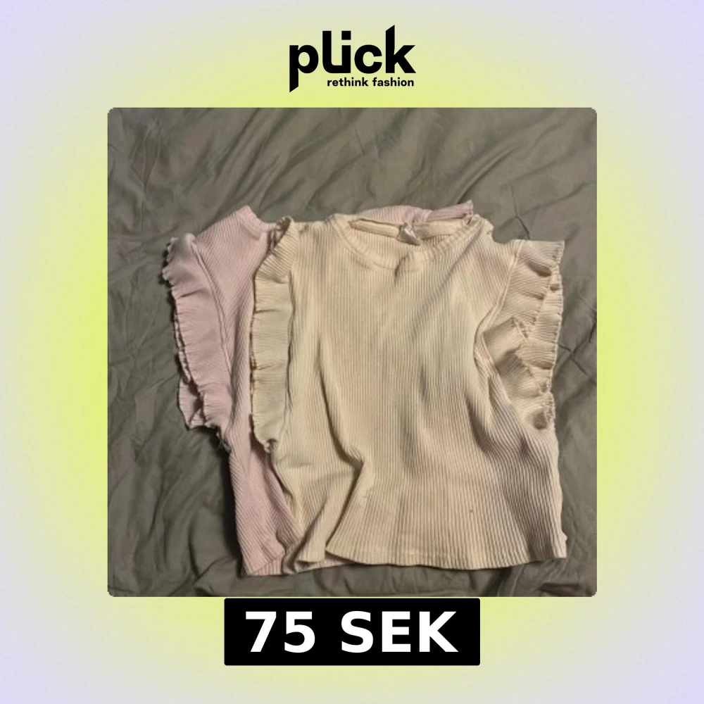 Två ribbade toppar i ljusrosa och offwhite med volangdetaljer längs ärmarna. Topp med rund halsringning och korta ärmar, perfekt för en söt och stilren look. Materialet är mjukt och stretchigt.